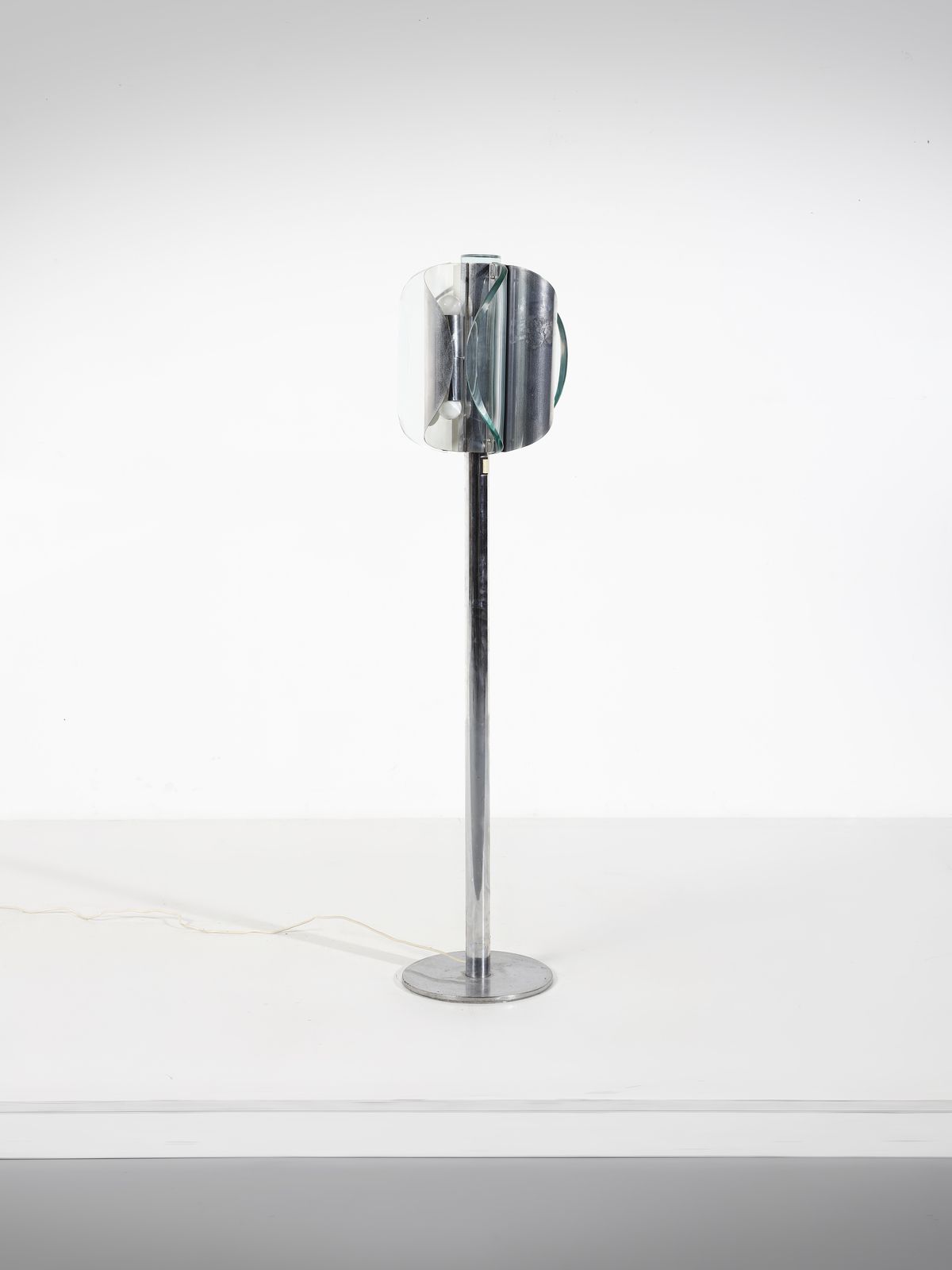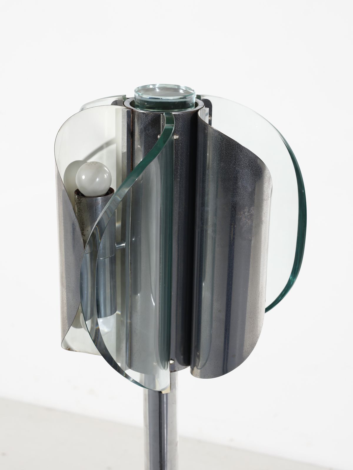 VELCA Lampada da terra. Metallo cromato e cristallo curvato.. Cm 144,50x38x38. Anni Settanta.
