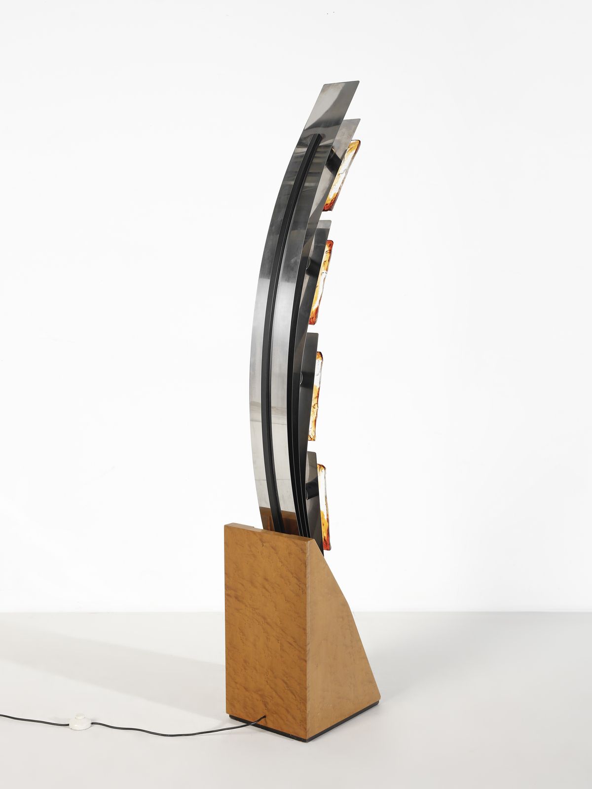 MANIFATTURA ITALIANA Lampada da terra. Metallo, radica e vetro.. Cm 180x29x36. Anni Settanta.