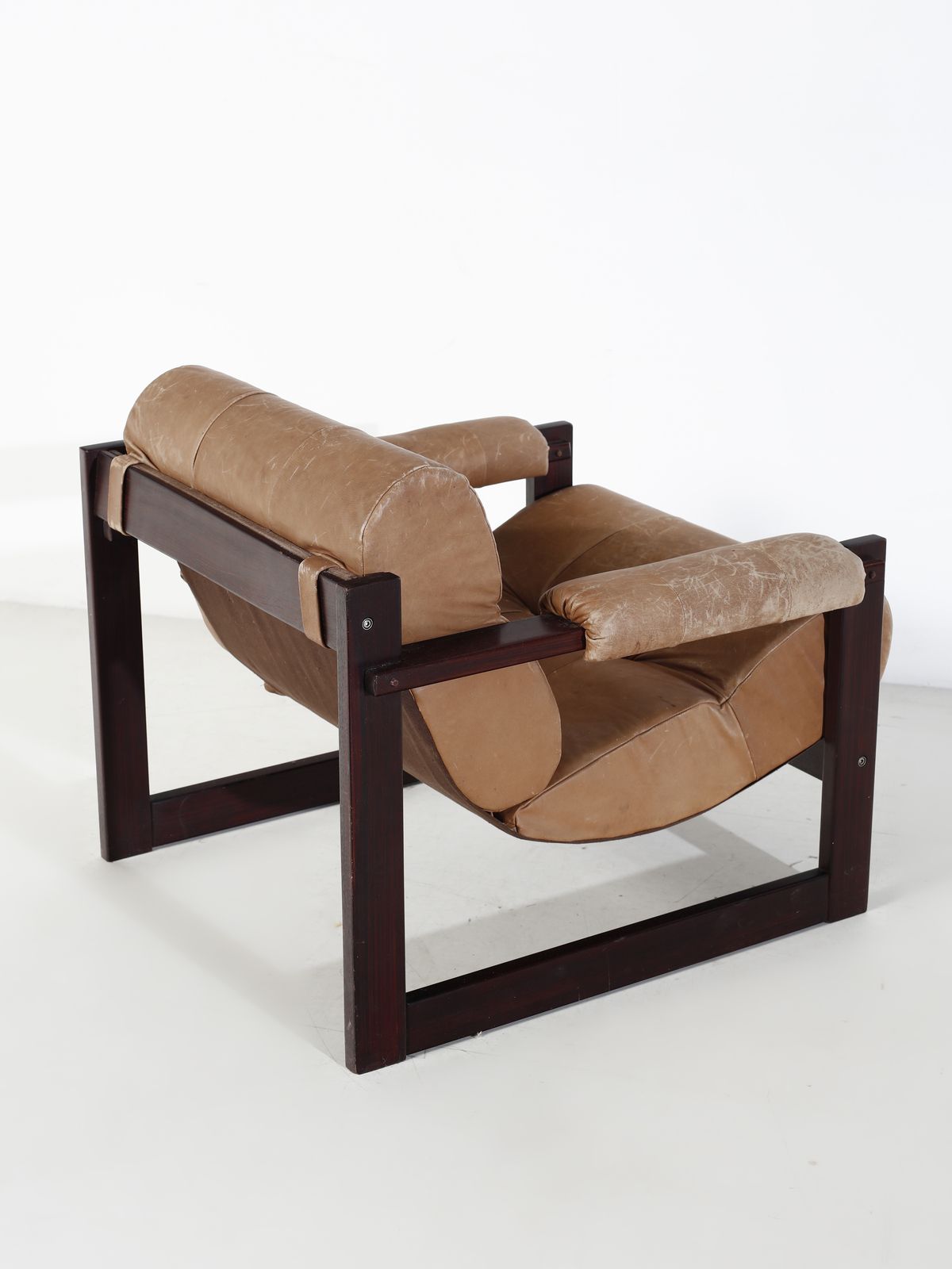 LAFER PERCIVAL (n. 1936) Poltrona. Legno e pelle imbottita.. Cm 70x80x88. Anni Sessanta.