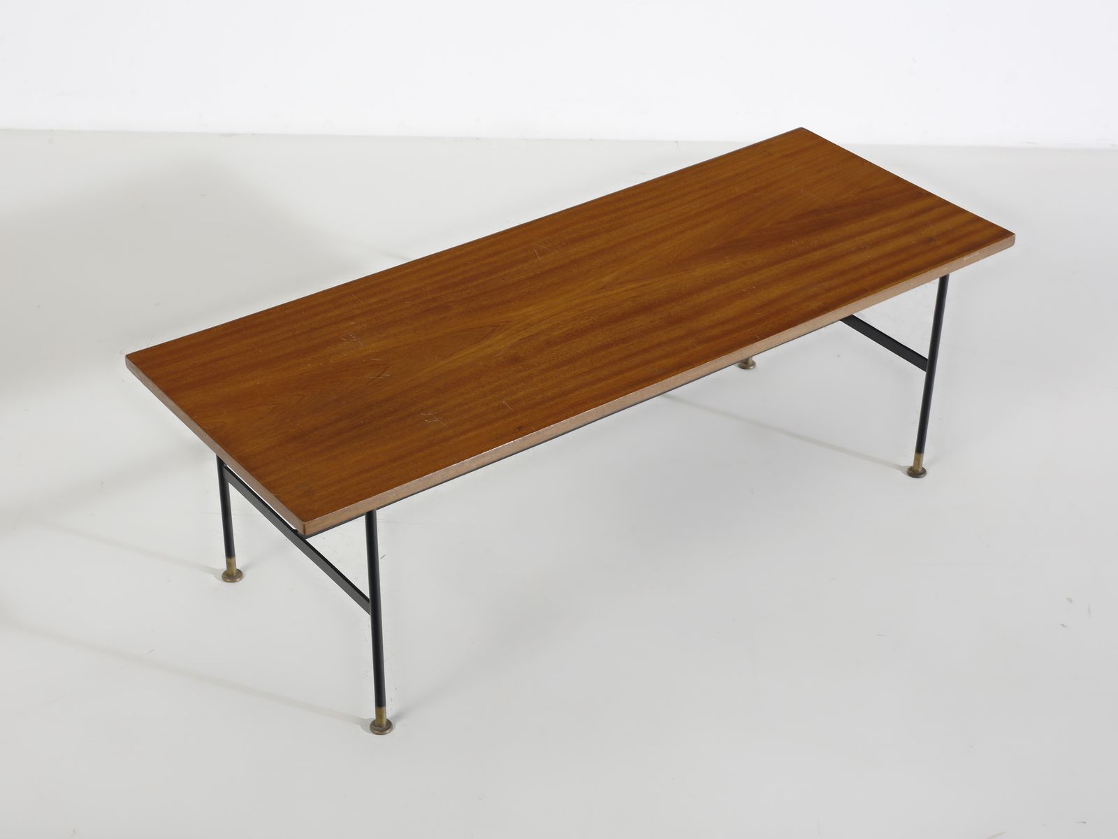 MANIFATTURA ITALIANA Tavolino da salotto. Legno di mogano, metallo verniciato, ottone.. Cm 40x130x35. Anni Cinquanta.