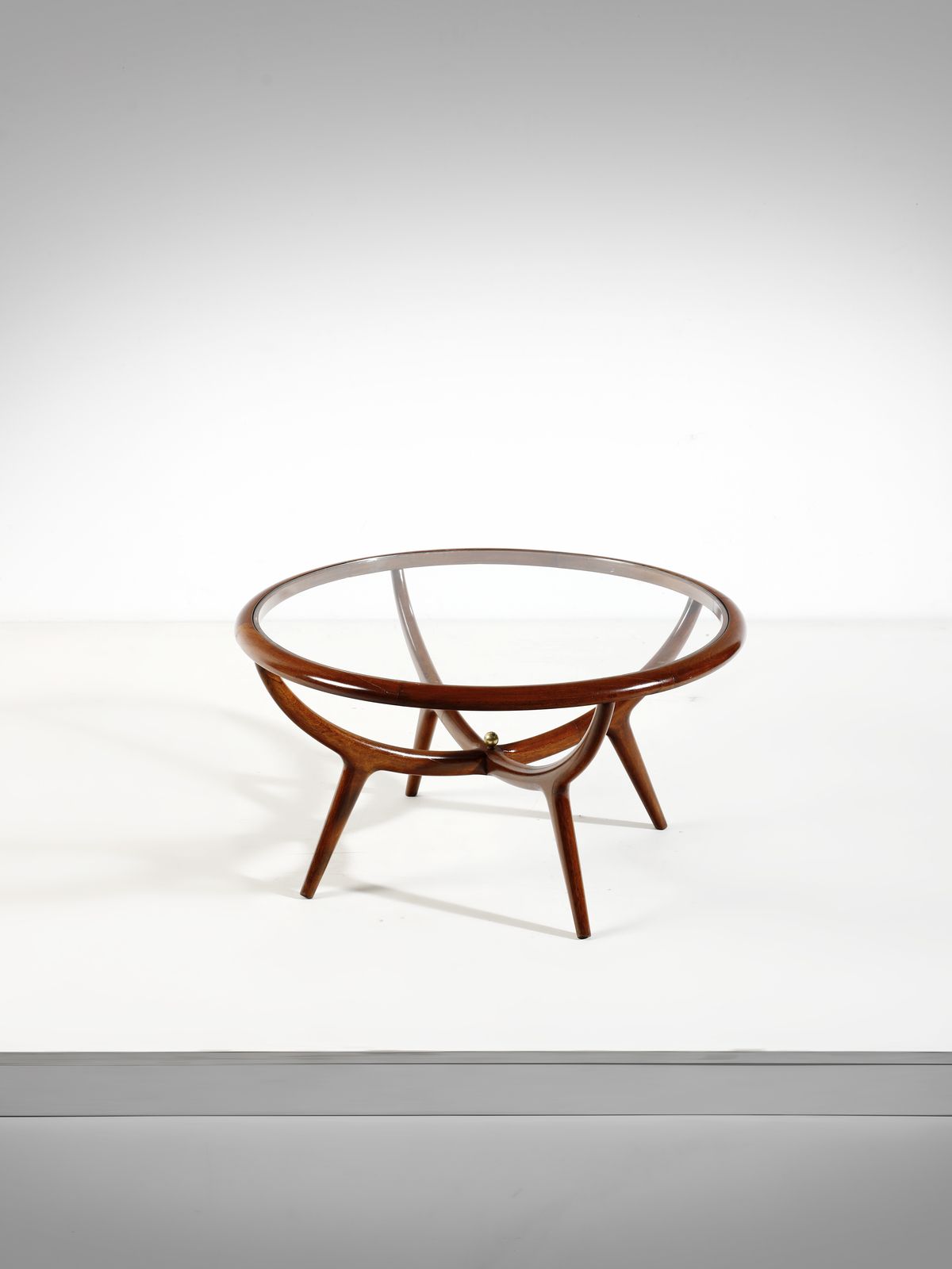 MANIFATTURA BRASILIANA Tavolino da salotto. Legno, ottone e vetro.. Cm 45x82x82. Anni Cinquanta.