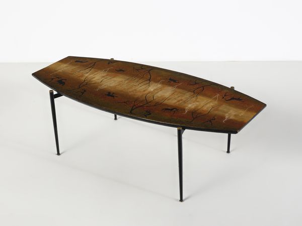 MANIFATTURA ITALIANA Tavolino da salotto. Ottone, metallo verniciato e legno.. Cm 42x130x60. Anni Settanta.