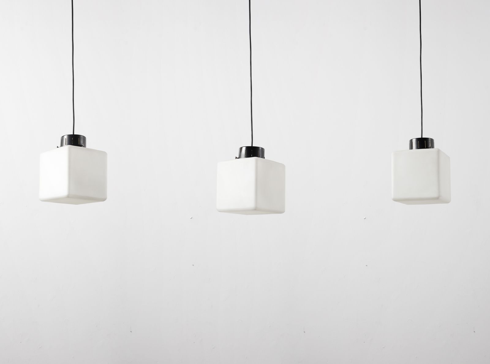 MANIFATTURA ITALIANA Tre lampade a sospensione. Metallo verniciato e vetro opalino satinato.. Cm 30x20x20. Anni Sessanta.