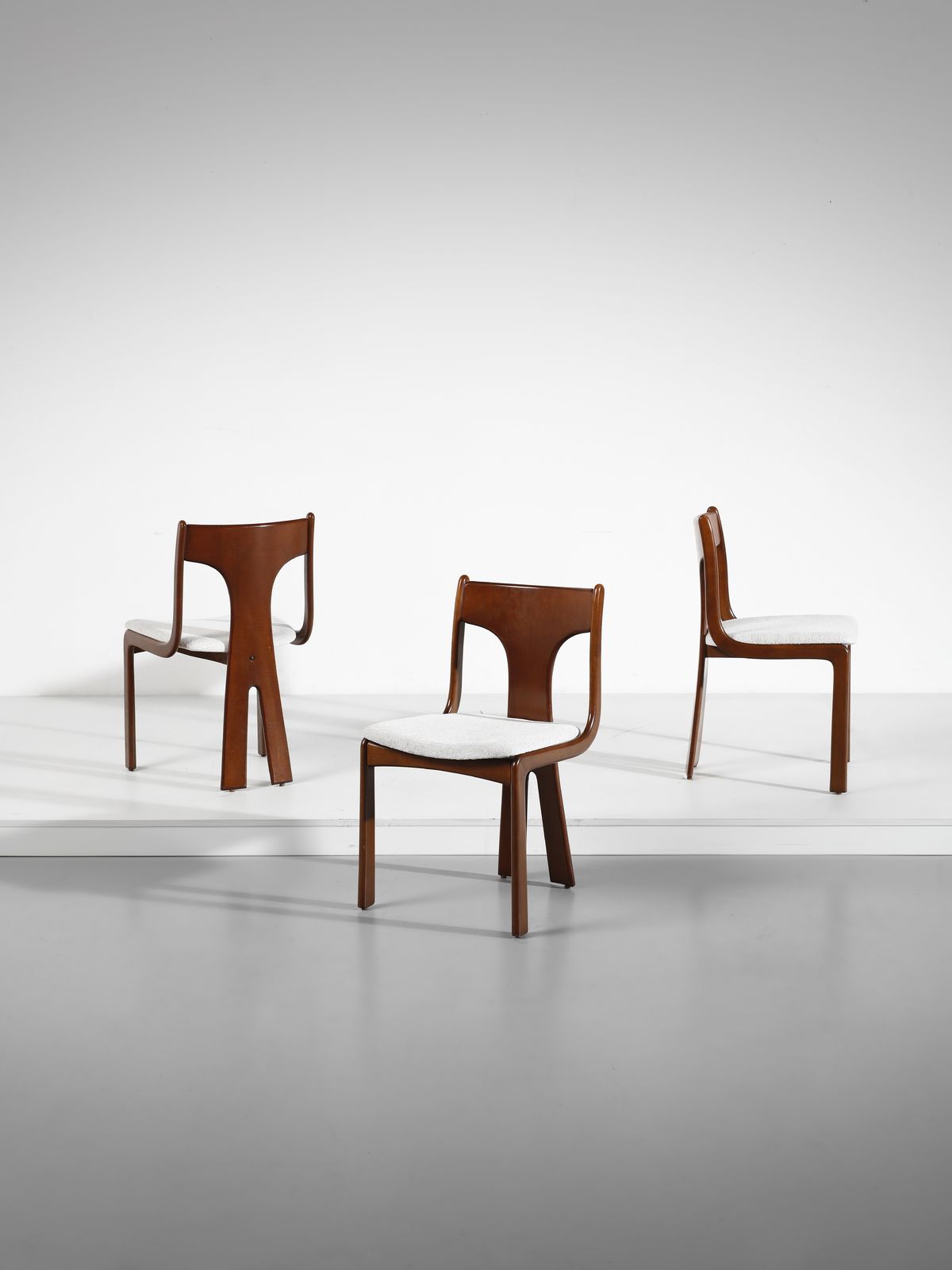 MANIFATTURA ITALIANA Tre sedie. Legno multistrato e tessuto imbottito. Cm 79x45x45. Anni Settanta.
