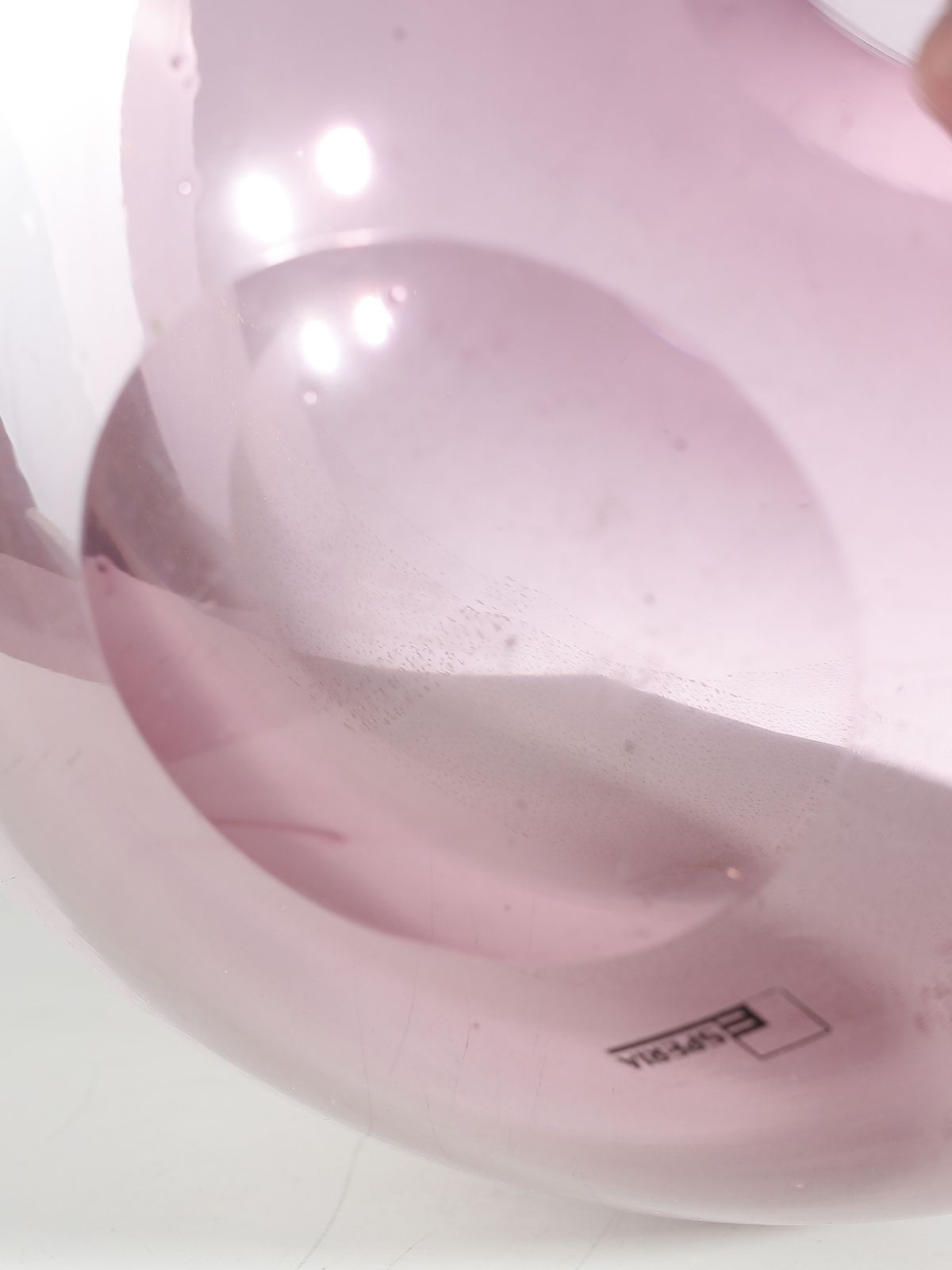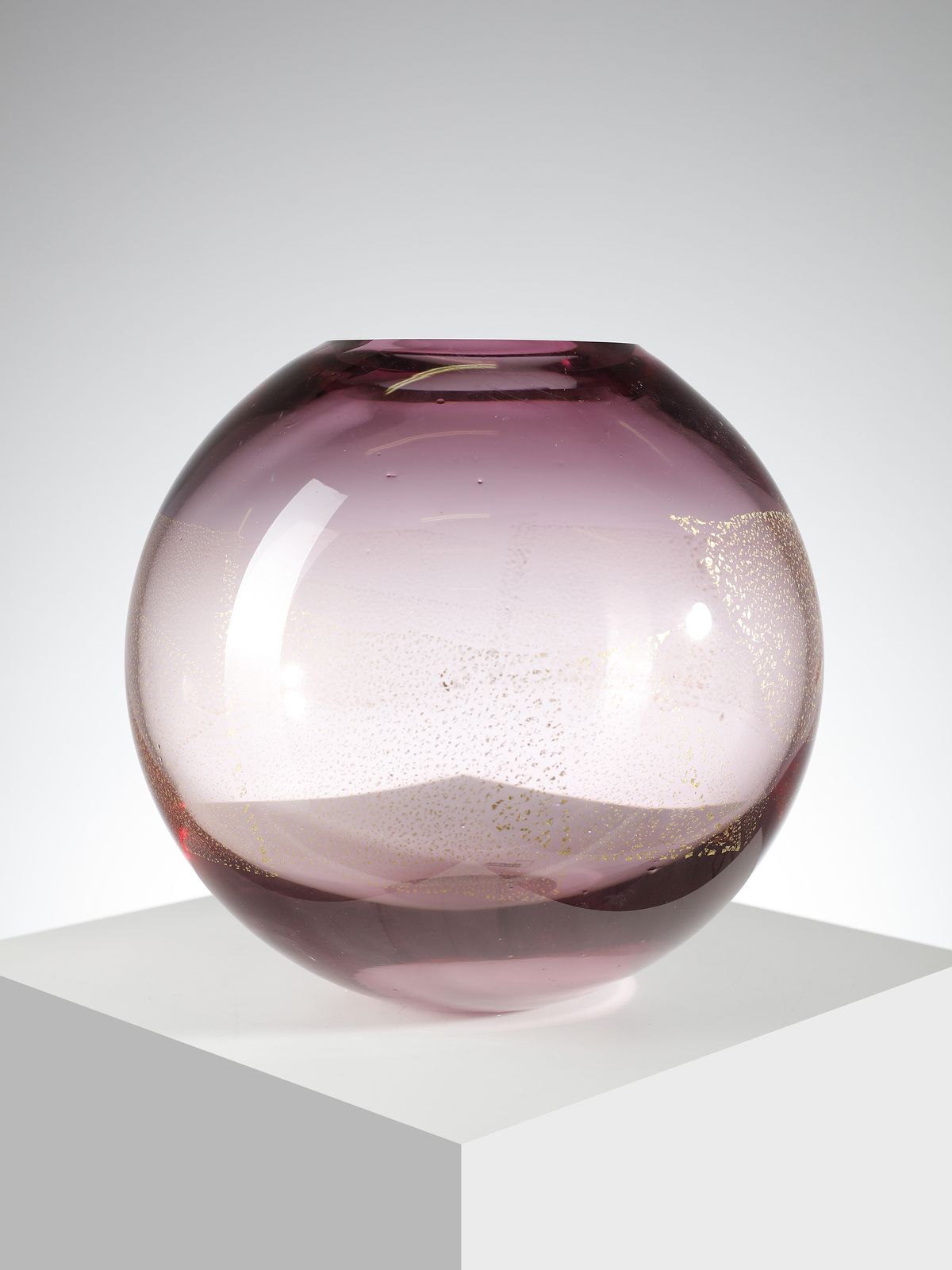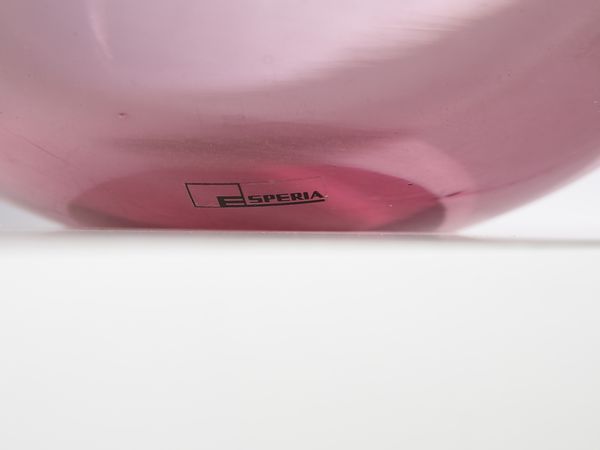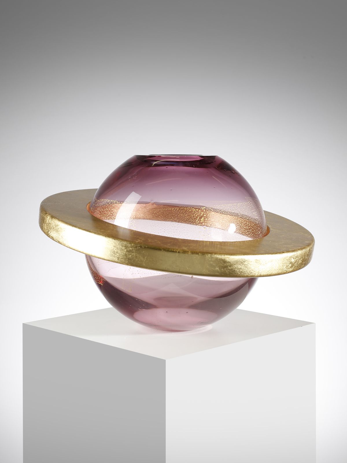 BROTTO ANGELO (1914 - 2002) Vaso-scultura per Esperia, Poggibonsi. Vetro trasparente ametista con inclusione di foglia oro e legno dorato.. Cm 35x50x50. Anni Settanta.Etichetta della produzione.