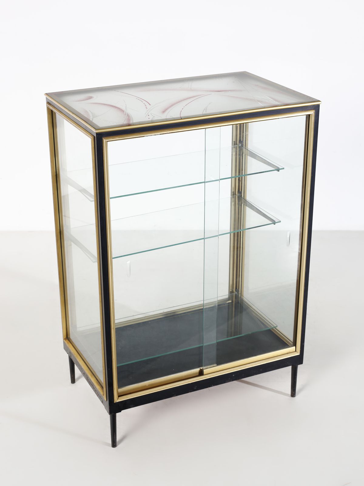 MANIFATTURA ITALIANA Vetrina a tre ripiani con ante scorrevoli. Cristallo curvato, vetro lattimo, ottone e metallo verniciato.. Cm 104x71x46. Anni Sessanta.