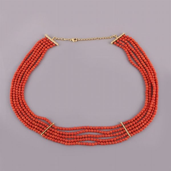 a cinque fili di sfere di corallo, barrette di separazione e chiusura in oro giallo, gr. 48,8. Lunghezza 47 cm ca.