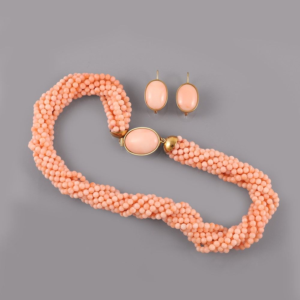 composto da girocollo 'torchon' a nove fili di sfere di corallo rosa con chiusura in oro giallo e corallo rosa ovale, orecchini 'en suite' in oro giallo, gr. complessivi 86,6. Lunghezza 40 cm ca.