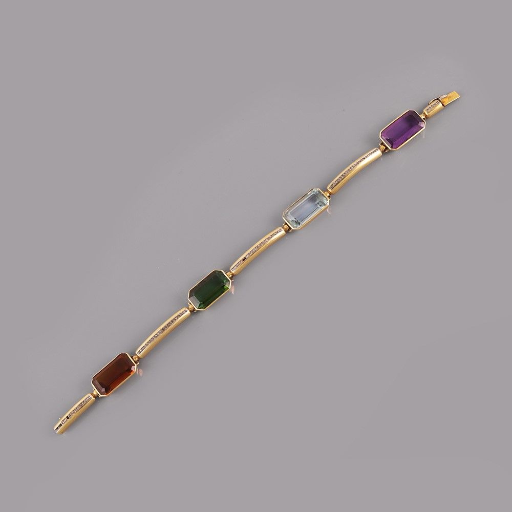 in oro giallo con gemme alternate a barrette percorse da diamanti taglio a rosa (tre mancanti), gr. 19,7. Lunghezza 19 cm