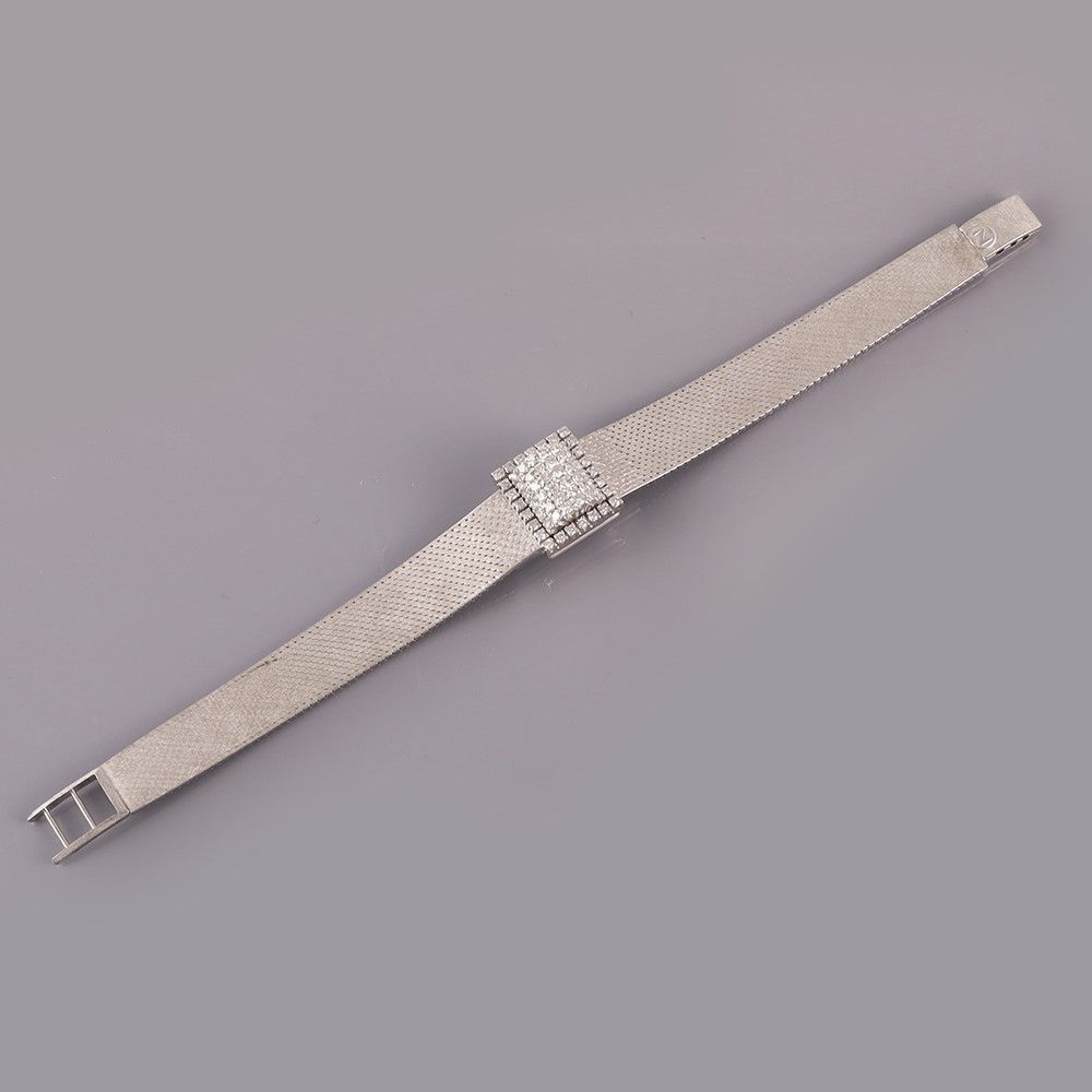 in oro bianco, movimento meccanico a carica manuale, cassa rettangolare con quadrante a scomparsa, ornato da diamanti, gr. lordi 48. Lunghezza 16 cm ca.