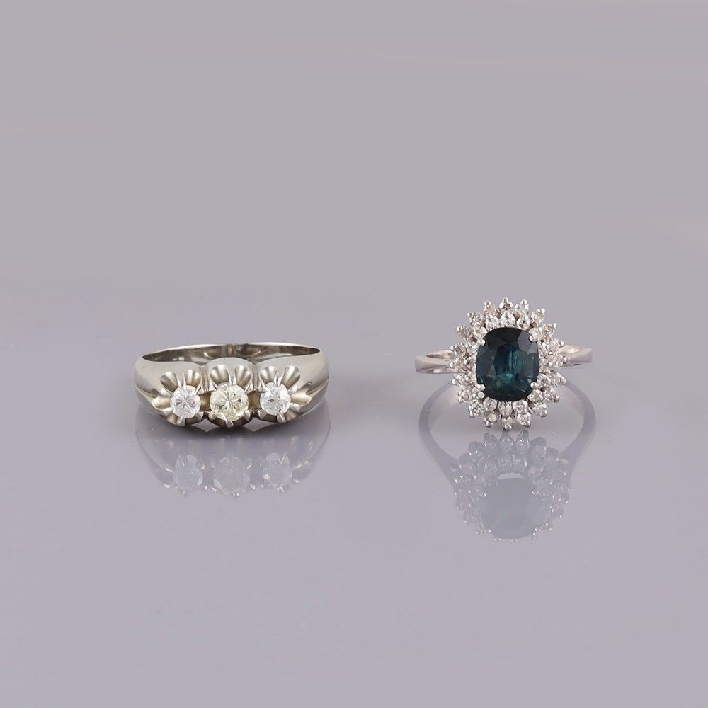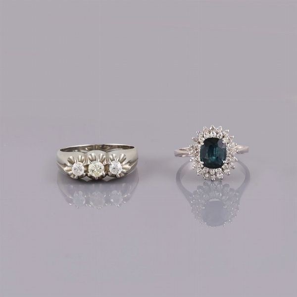 in oro bianco con zaffiro ovale contornato da piccoli diamanti e con tre brillanti disposti in linea (sbeccature), gr. complessivi 12,6. Misura 15,5 e 19,5