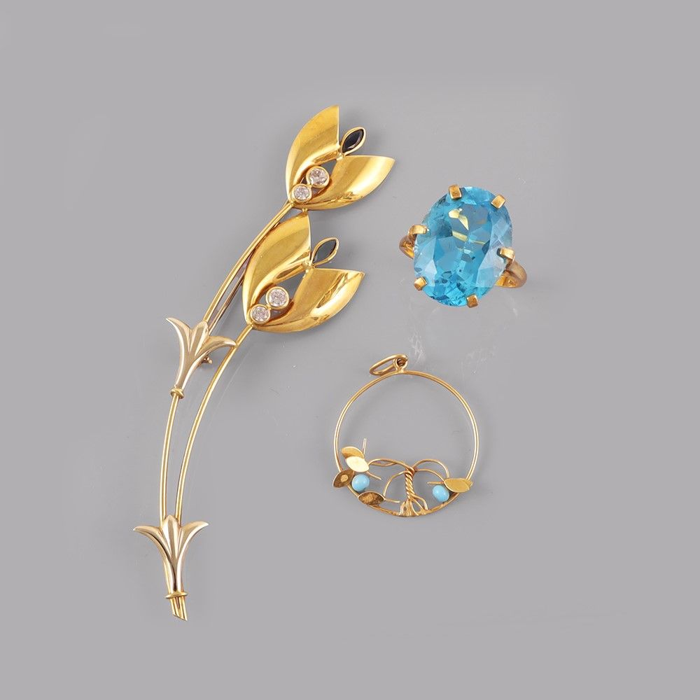 composto da spilla, pendente e anello in oro con pietre sintetiche, gr. complessivi 17,6. Misura anello 22