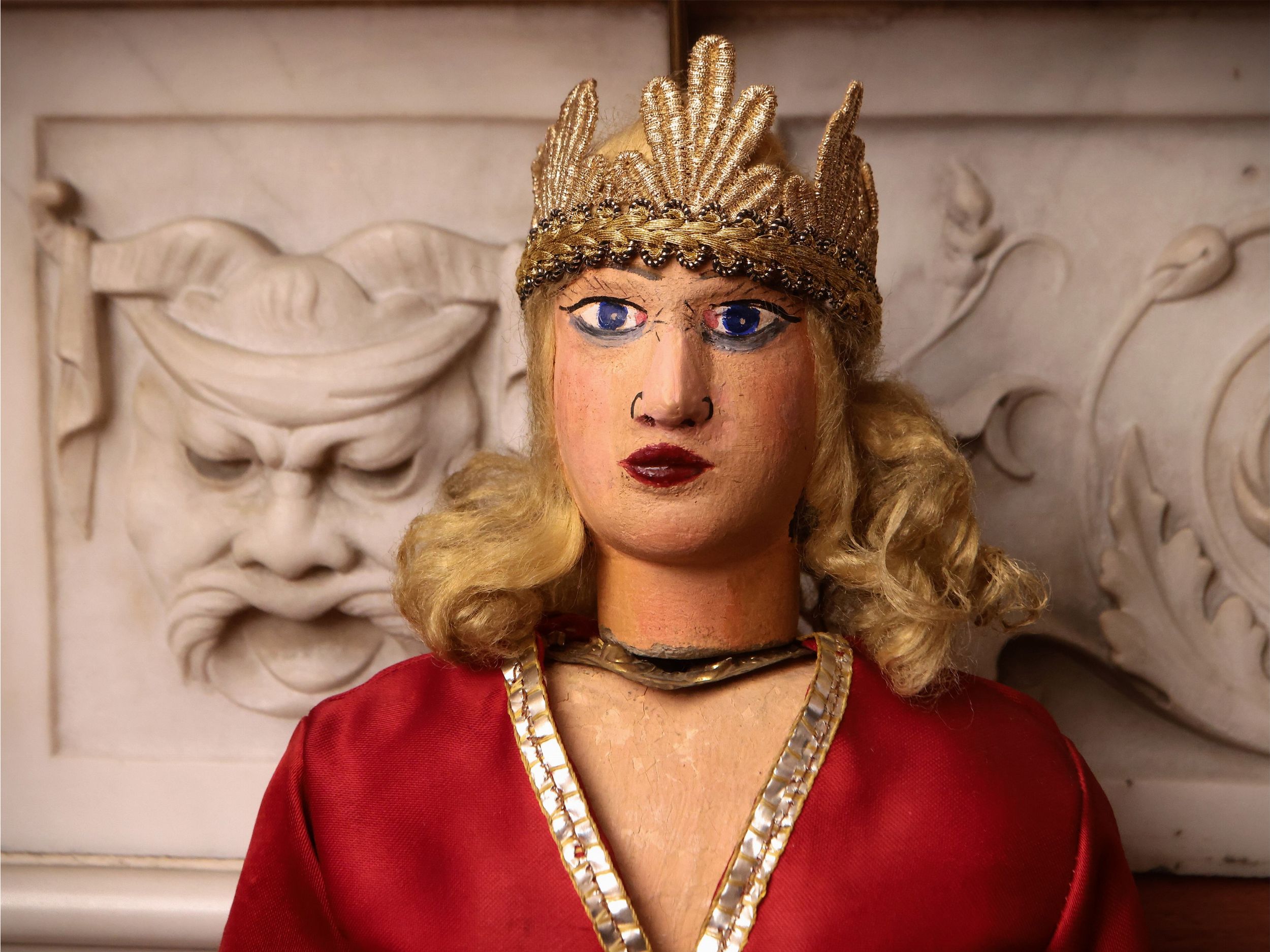 XX secolo due pupi siciliani in legno dipinto, abiti in varie tipologie di tessuti e latta