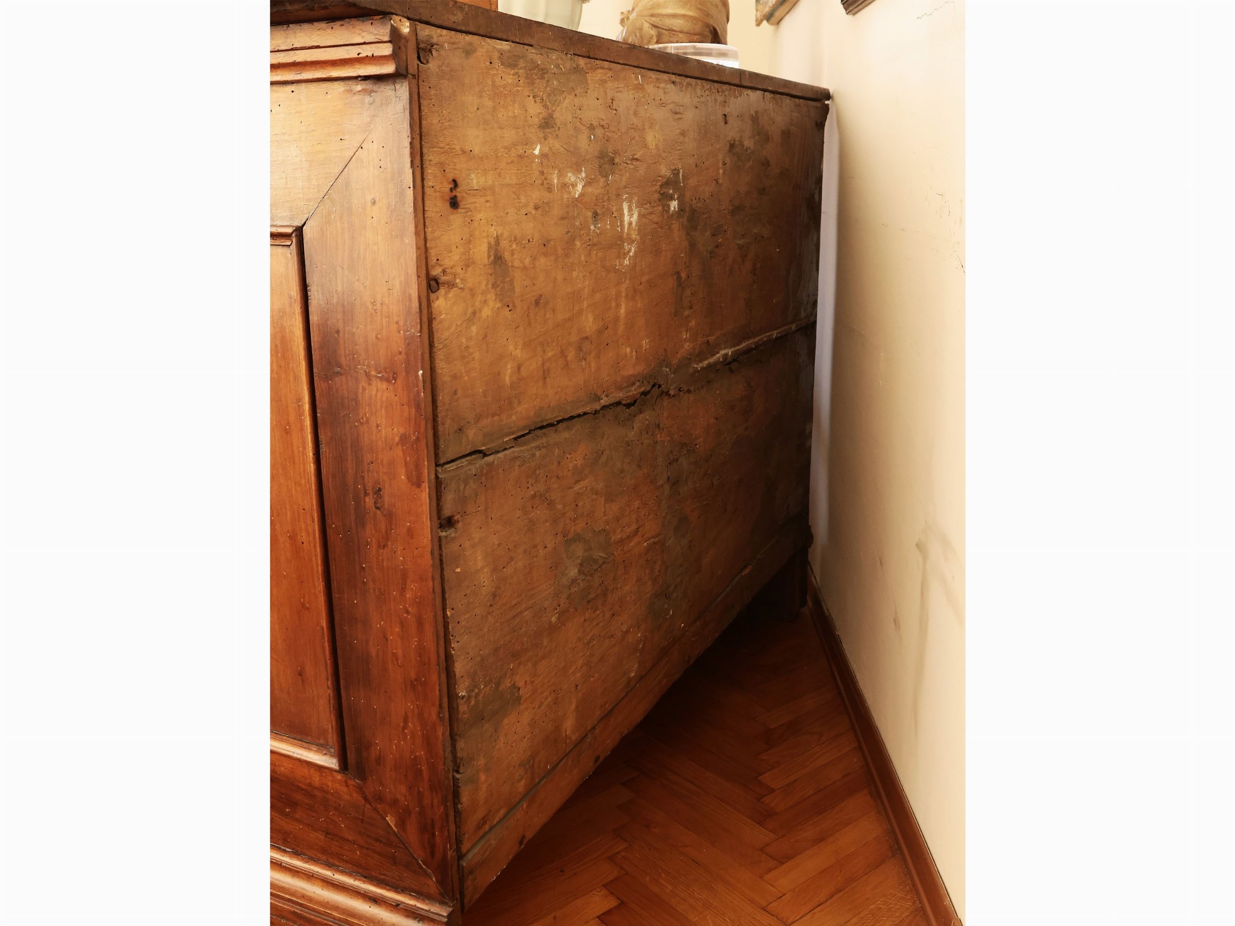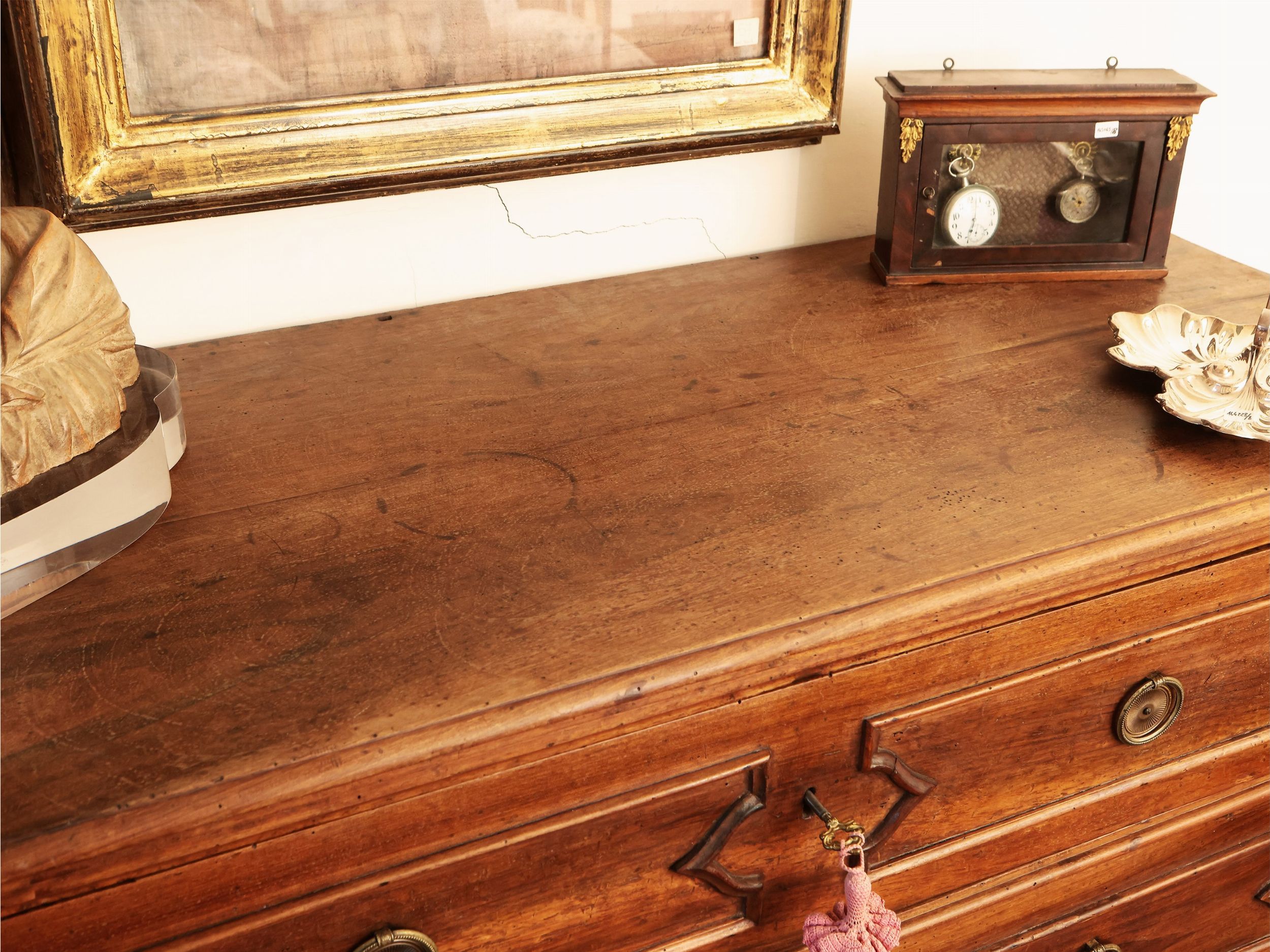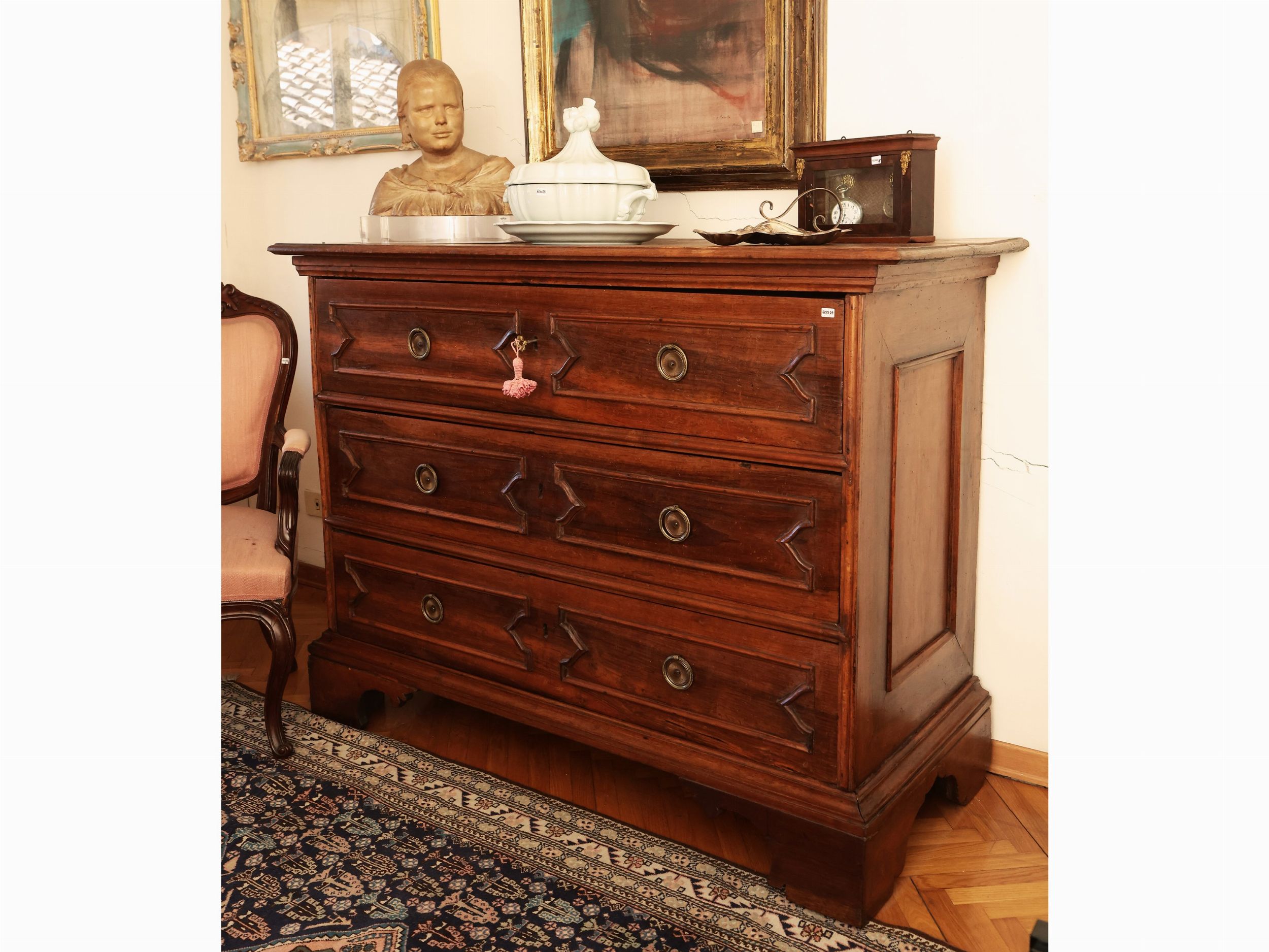 XVII secolo tre cassetti con formelle sagomate in rilievo sul fronte dritto, piedi a mensola