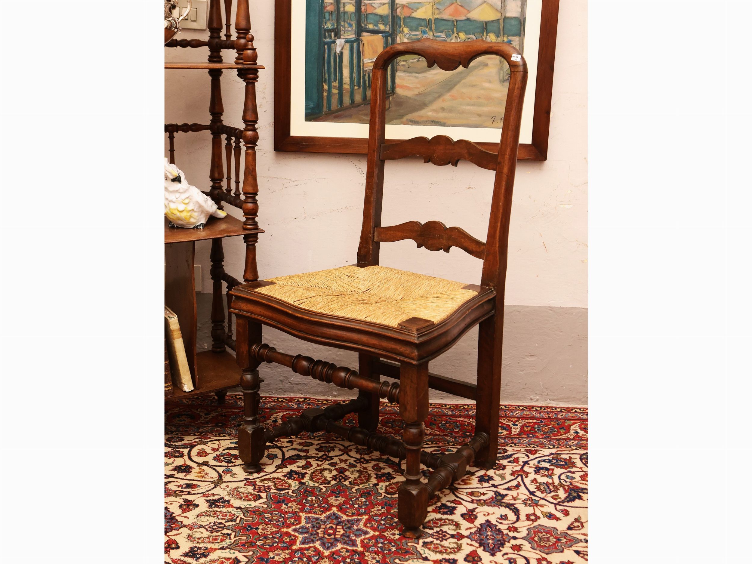 XIX/XX secolo schienale sagomato con cartella tripartita, seduta impagliata, gambe tornite riunite da traverse