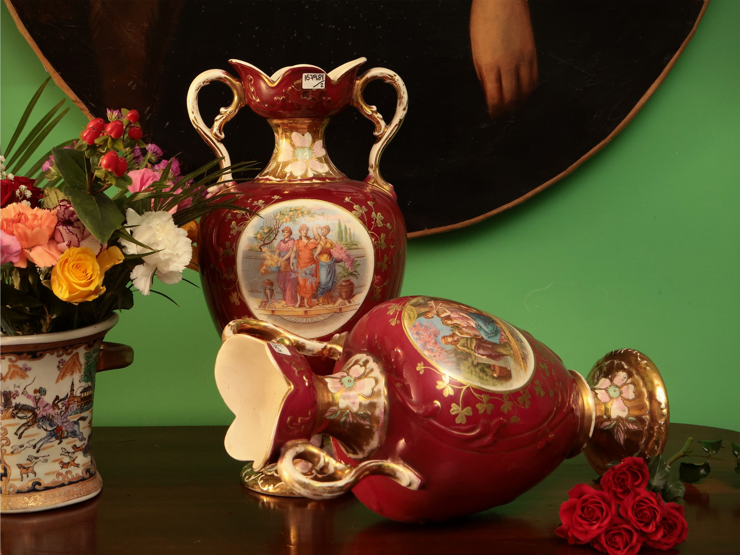 seconda metà del XIX secolo dipinti in policromia con figure allegoriche entro riserve circolari lumeggiate in oro con tralci floreali su fondo magenta, bordo mosso e prese laterali a voluta, lievi difetti