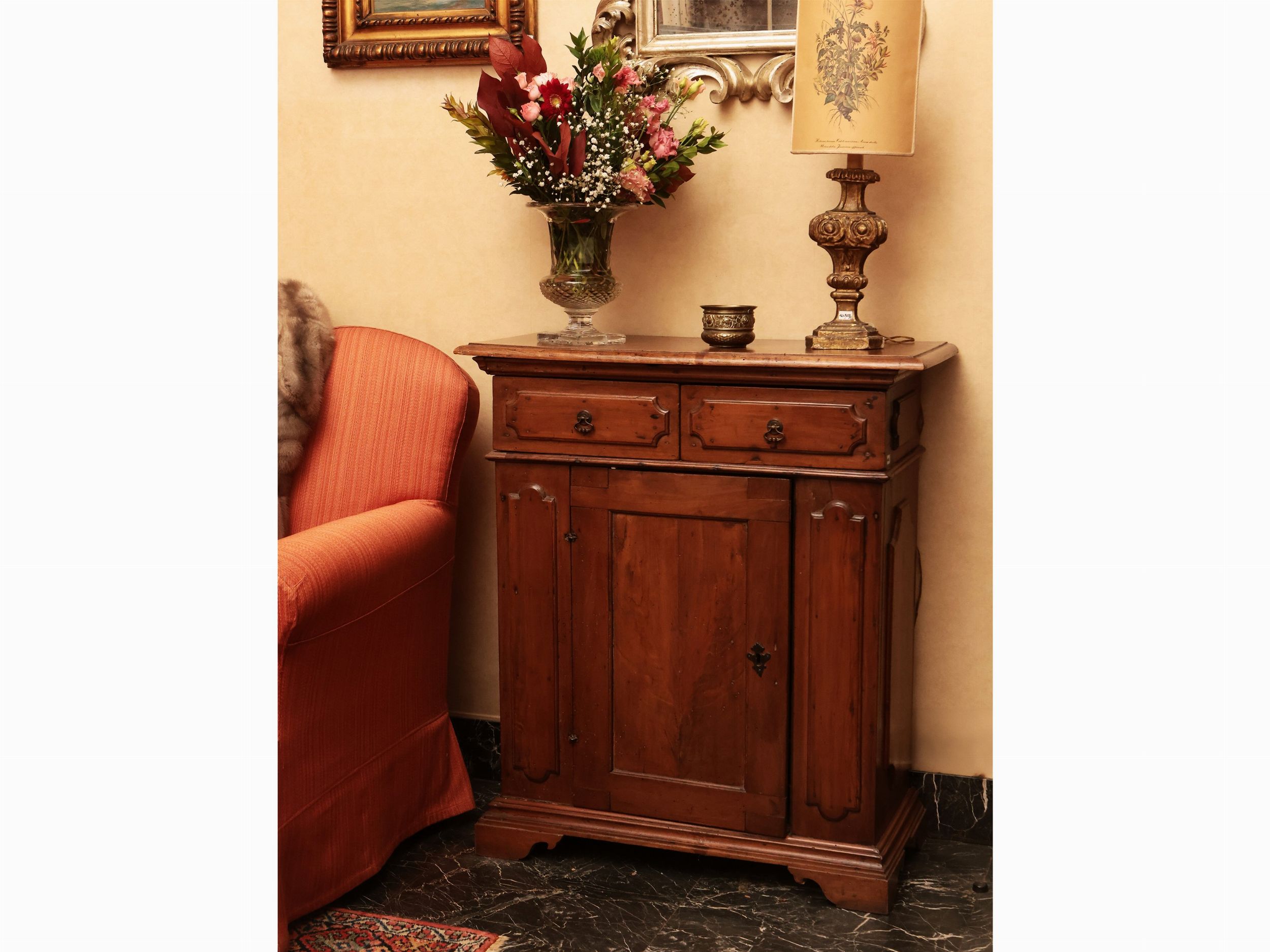 XVII secolo due cassetti ed uno sportello tra lesene intagliate, piedi a mensola