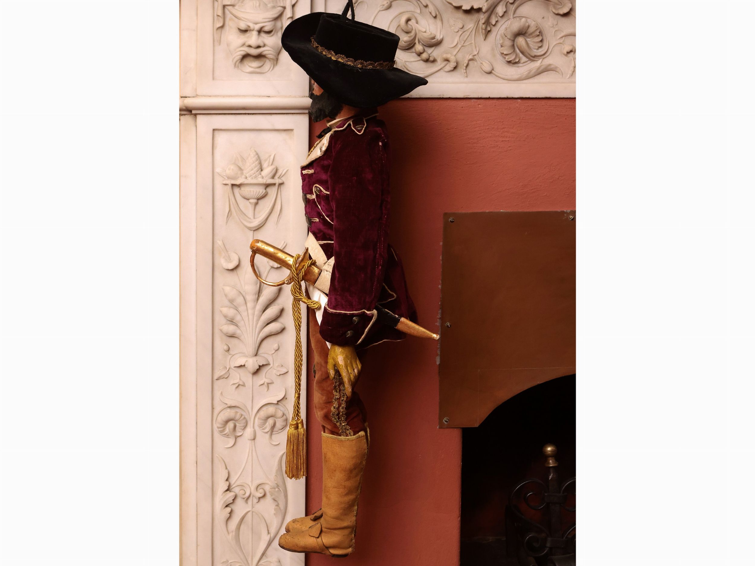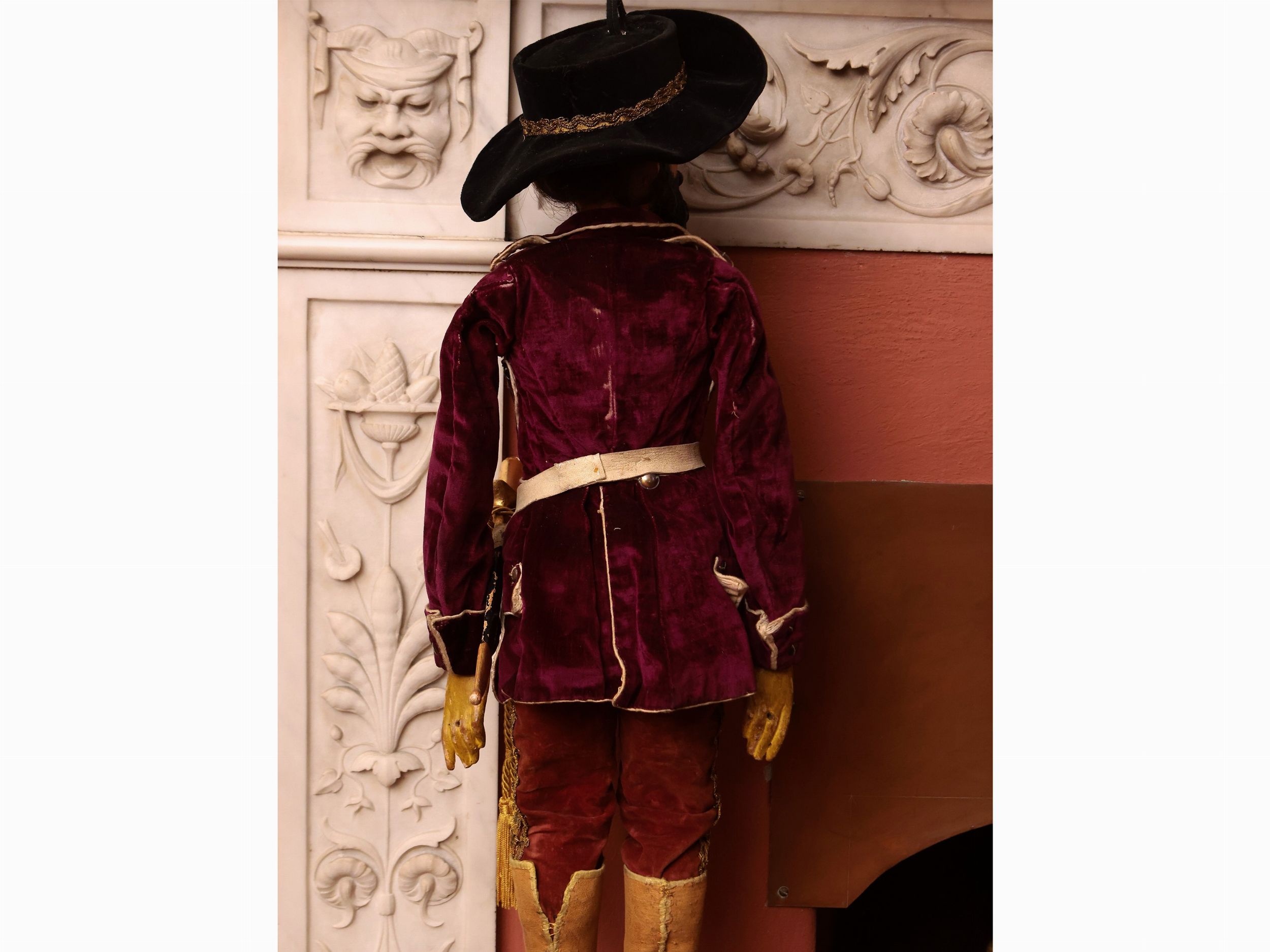 h cm 70 circa metà del XIX secolo marionetta in legno dipinto realisticamente, occhi in vetro, capelli in crine, abiti in velluto violaceo, ruggine e ocra e gallone dorato, bottoni in metallo, cappello a larga falda in velluto nero, stivali in pelle chiara, alcuni lievi difetti