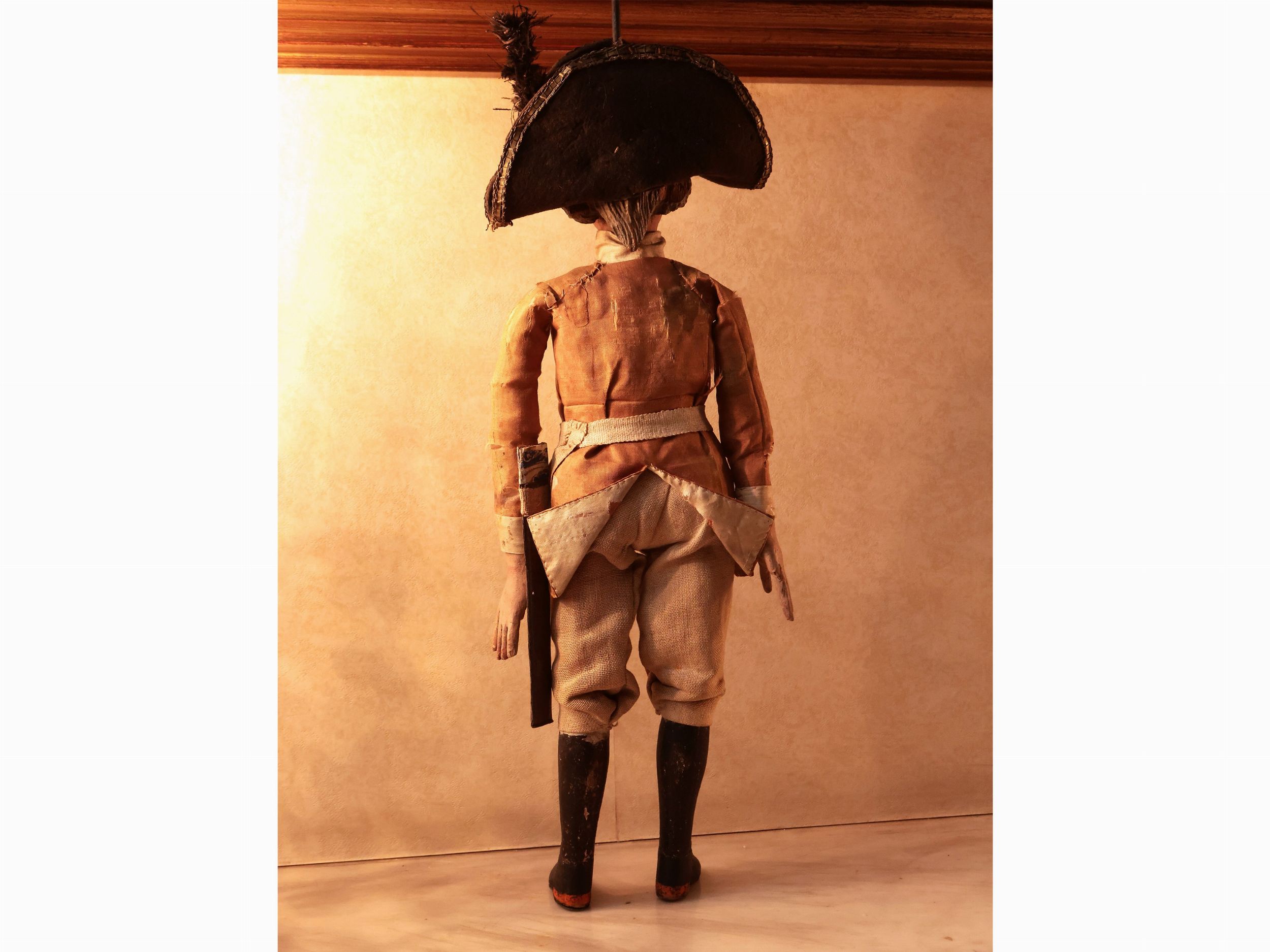 h cm 40 circa XIX secolo due marionette in legno dipinto, il personaggio maschile con ampia feluca in panno marrone, occhi in vetro, abiti in varie tipologie di tessuti nei toni del beige; il personaggio femminile con occhi in vetro, capelli naturali (difetti), abito in stile impero realizzato in varie tipologie di tessuti e velluto nei toni del marrone, entrambi con difetti e alcune mancanze
