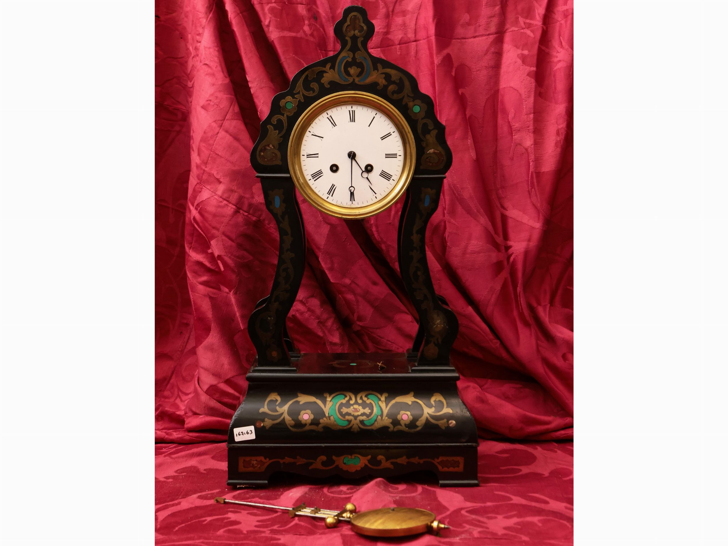 h cm 59x28x10 Francia, XIX secolo cimasa sormontata da pinnacolo, dipinto in policromia con fiori e girali e lumeggiature dorate, quadrante in smalto con numeri romani, base a plinto, corredato da pendolo, contenuto entro campana coeva con base in legno