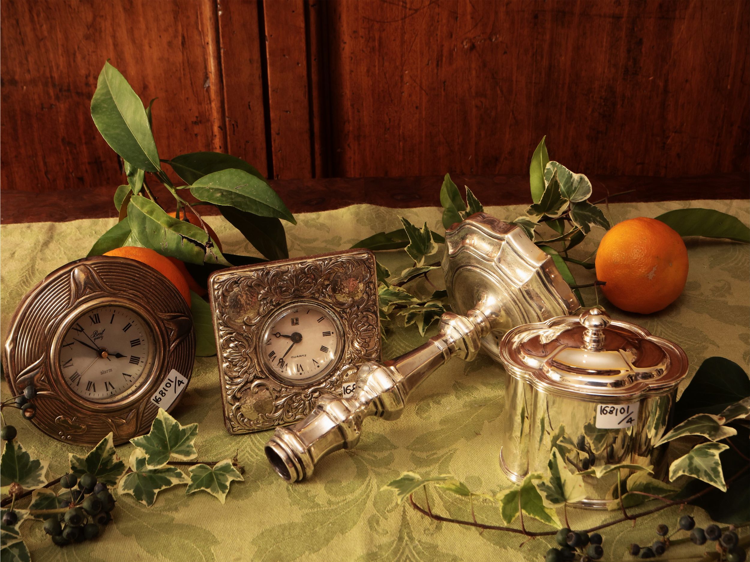 composto da un candeliere con fusto tornito su base sagomata, una zuccheriera polilobata e due orologi da tavolo con cornice sbalzata