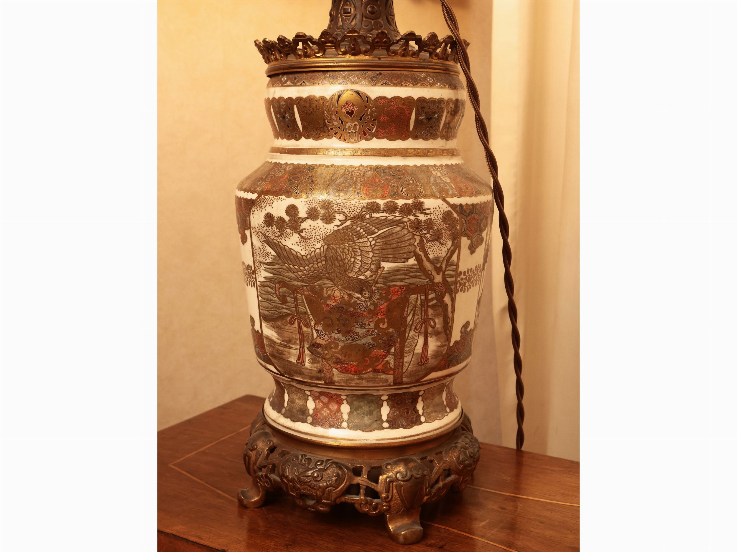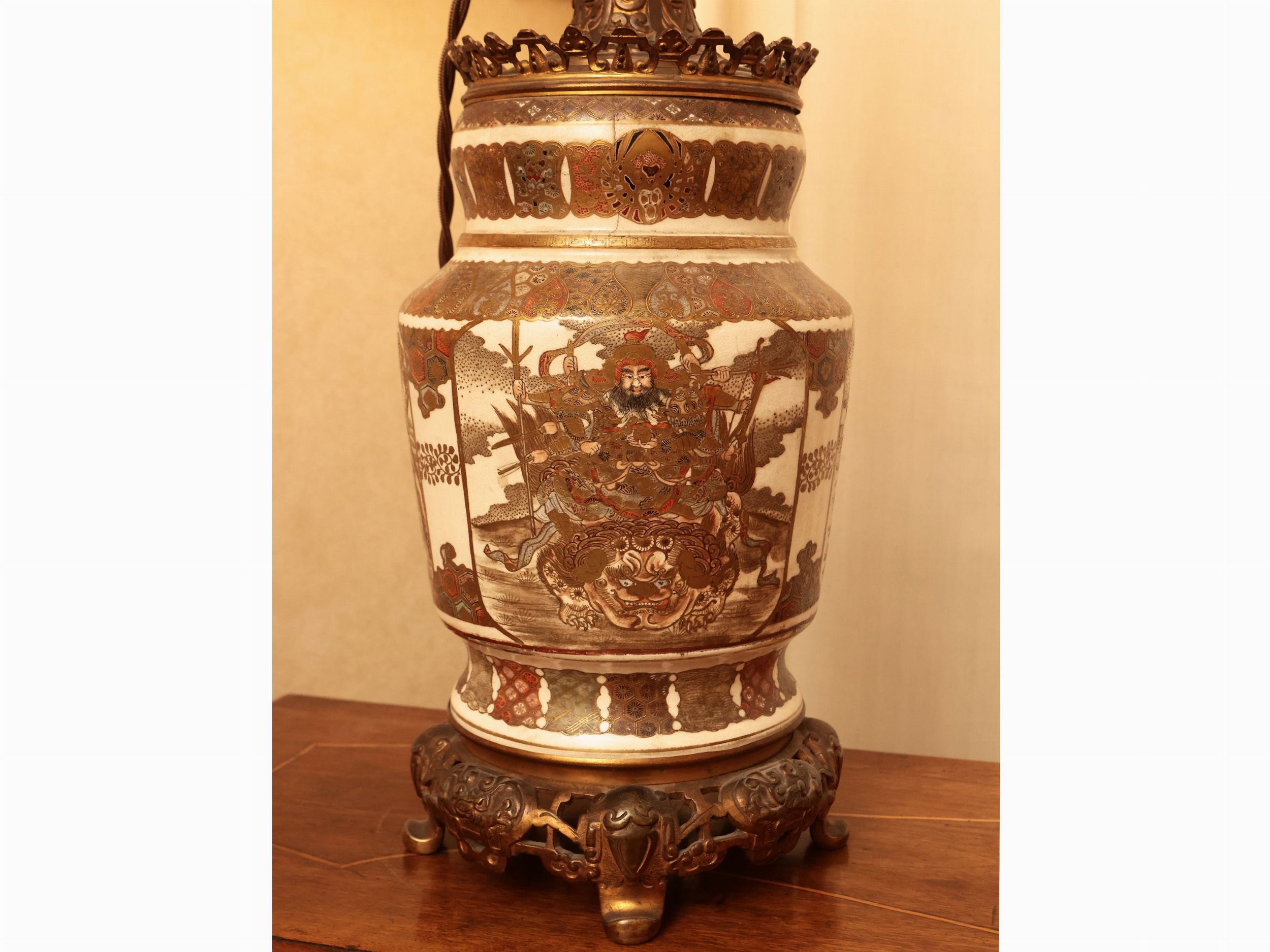 Giappone, fine del XIX/inizio del XX secolo realizzato con un vaso, decorato con divinità su tartaruga nei toni dell'oro, dell'arancio e del verde acqua, rilegato in metallo, bobeche in vetro, elettrificato