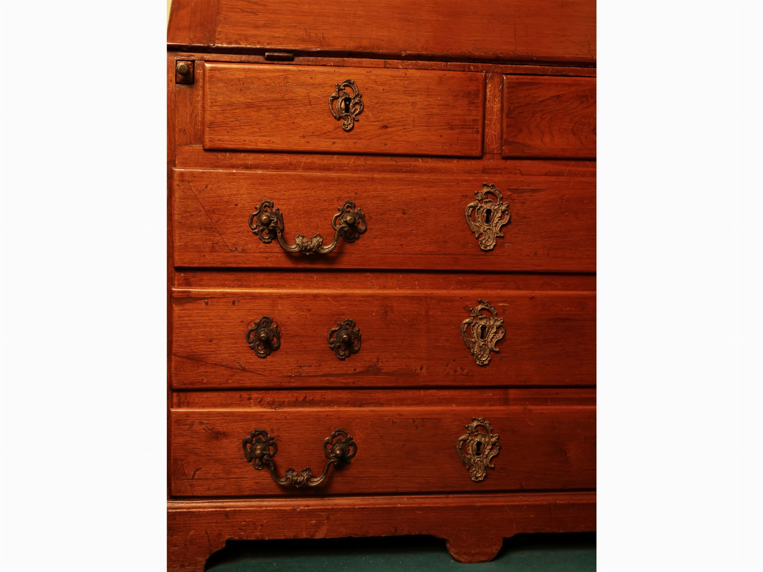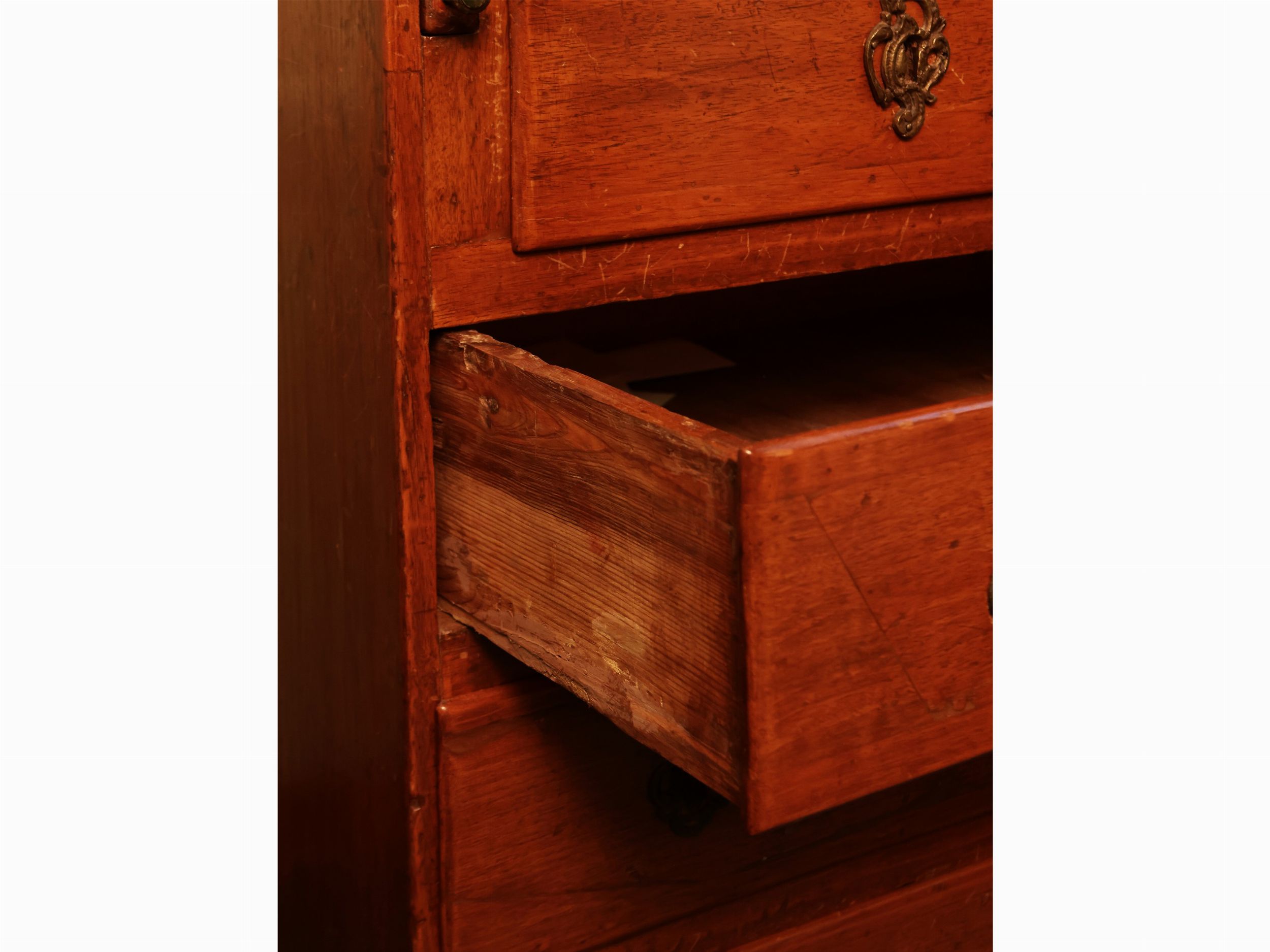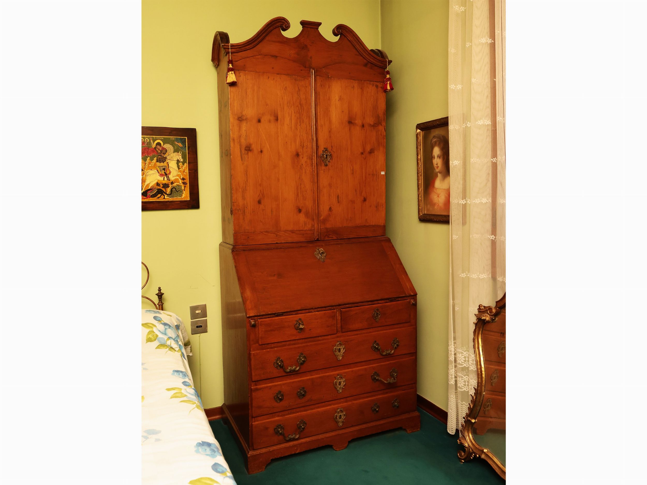 h cm 220x94x60 in parte del XVIII secolo cimasa a timpano spezzato, due sportelli con vani a giorno e cassettini nella parte superiore, in quella inferiore sportello a calatoio a celare scarabattolo con vano a giorno centrale, due mezzi cassetti e tre cassetti sottostanti, piedi a mensola