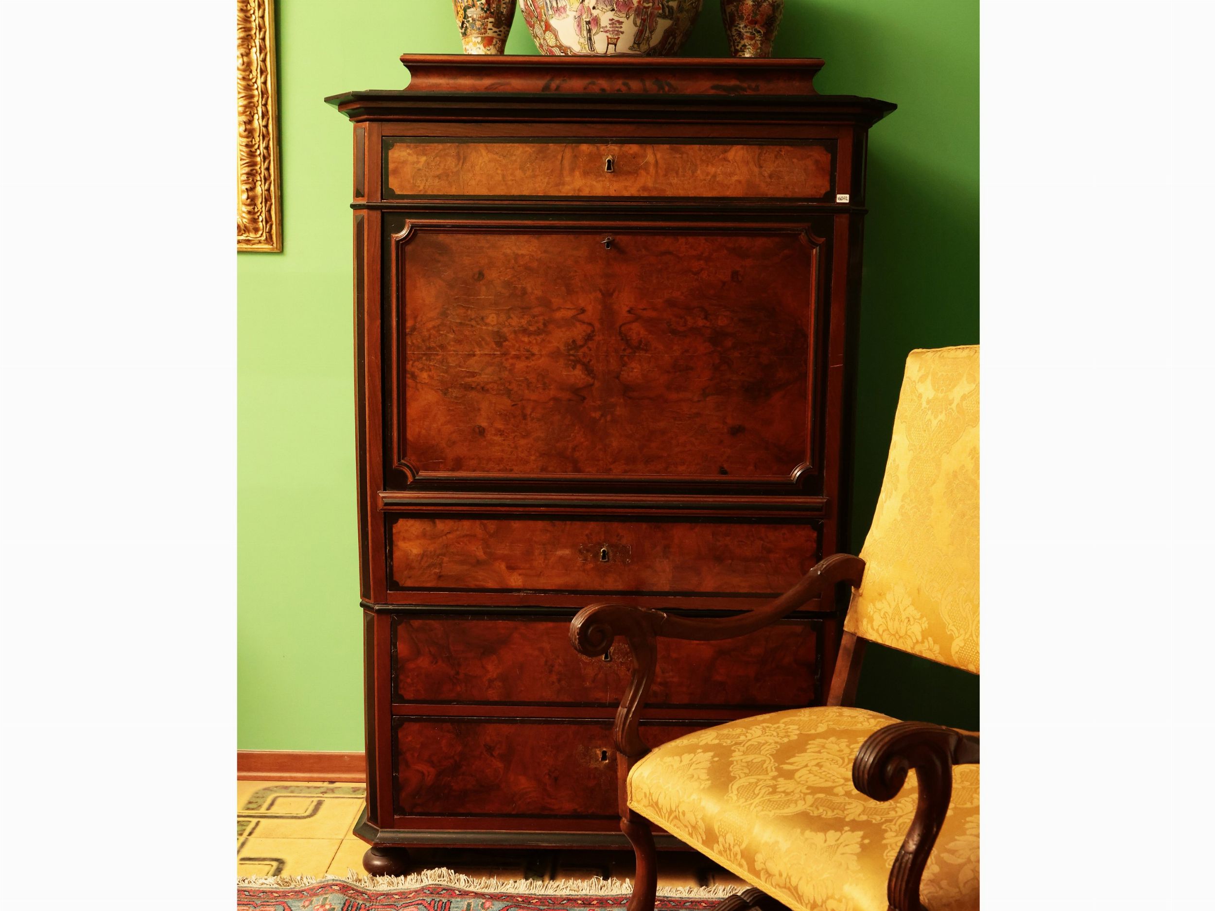 h cm 161x105x51 prima metà del XIX secolo profili in legno ebanizzato, cappello ad urna, sportello a calatoio a celare scarabattolo architettonico con vani a giorno, sportello centrale mosso e cassettini, tre cassetti sottostanti, piedi a cipolla