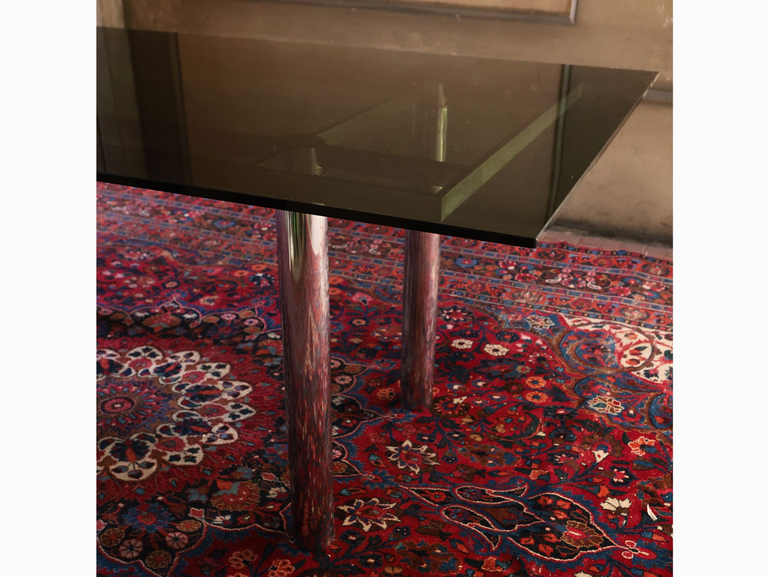Tavolo da pranzo in acciaio cromato e vetro fumé