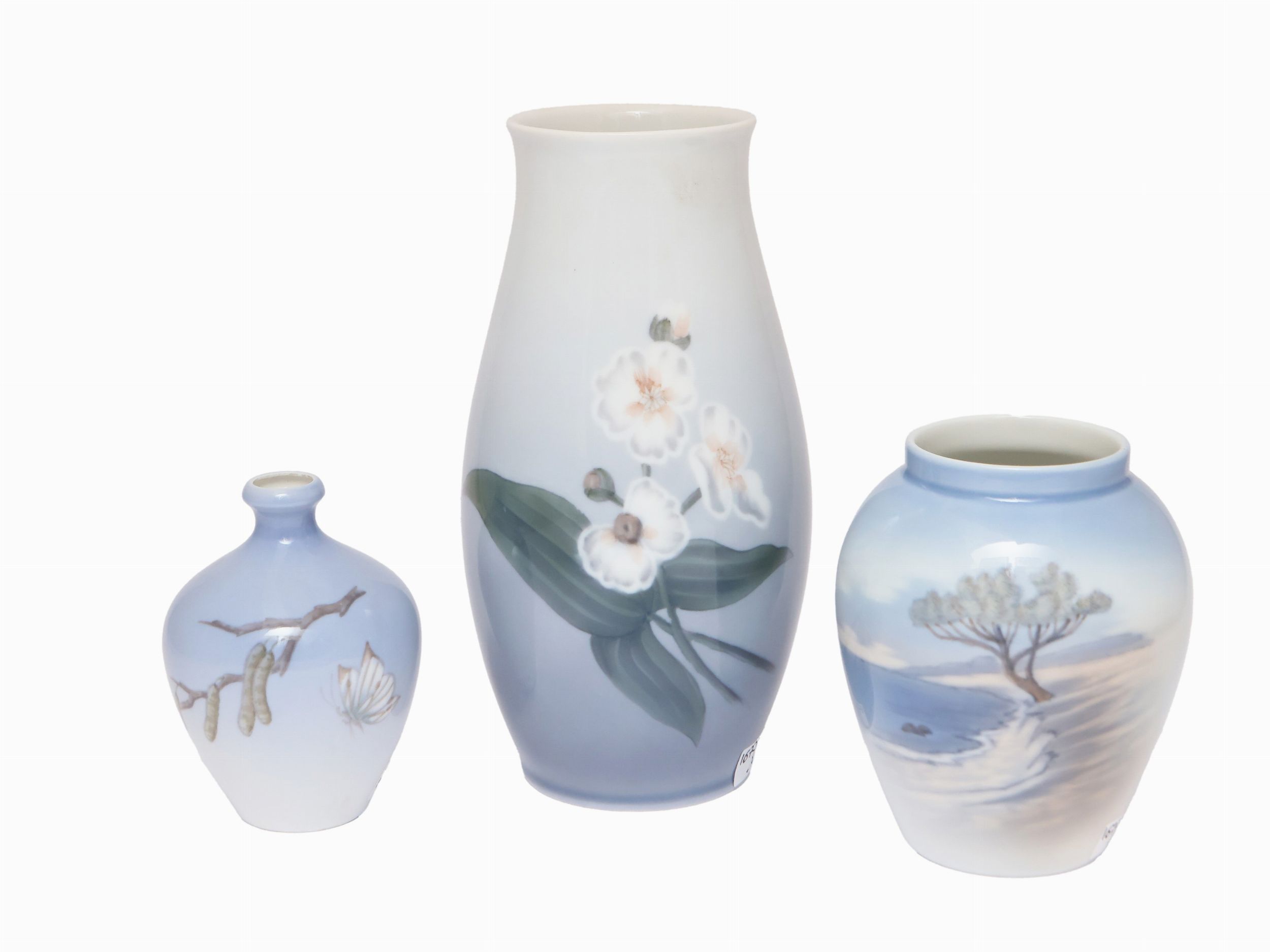 Danimarca, XX secolo decorato con fiori nei toni pastello su fondo azzurro, abbinato ad altri due vasi simili decorati con farfalle e paesaggi