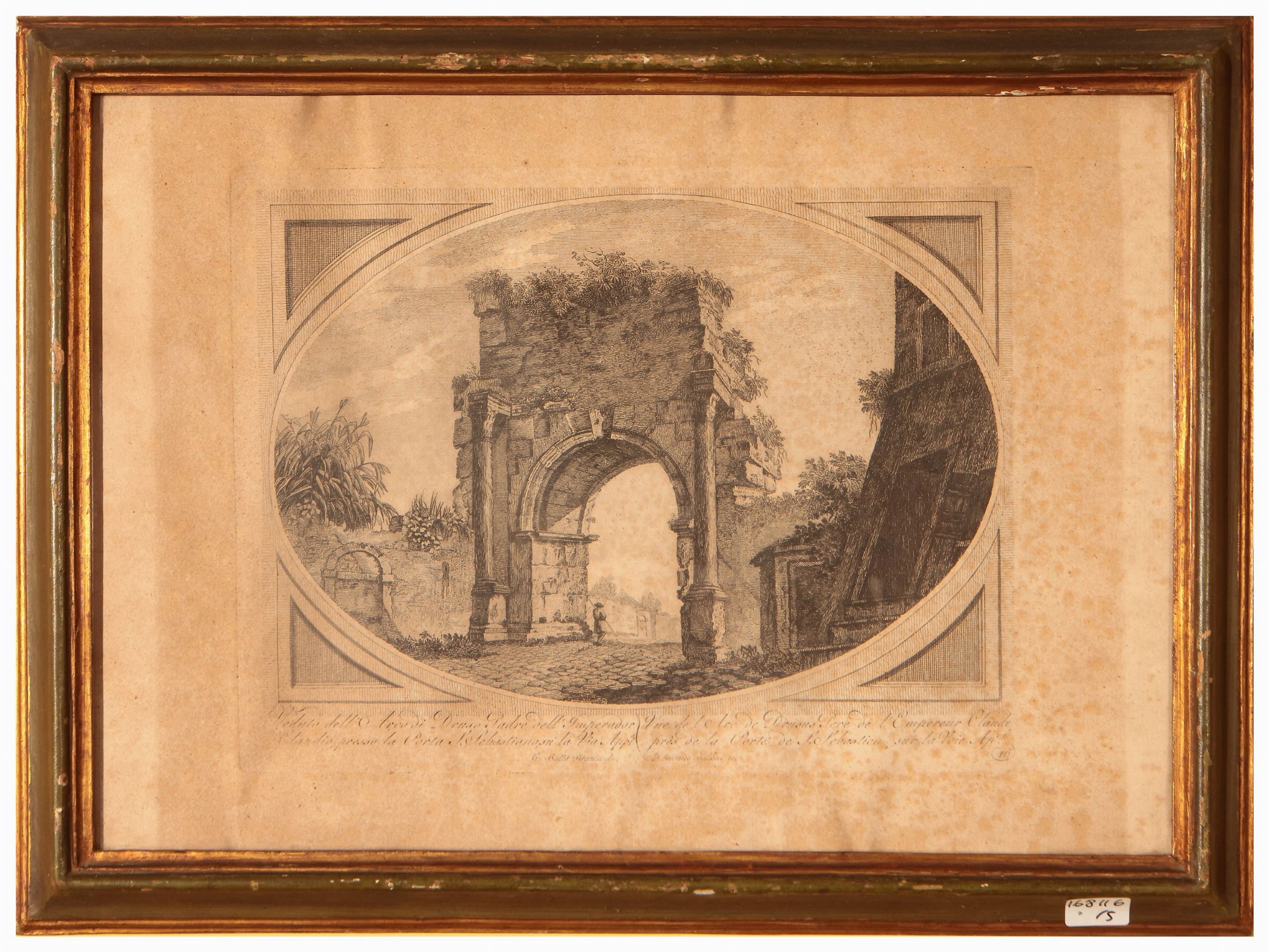 XIX secolo tre incisioni da Giovan Battista Piranesi, abbinate a Scene d'interno, due riproduzioni da incisioni di Volpato, fioriture, in cornice