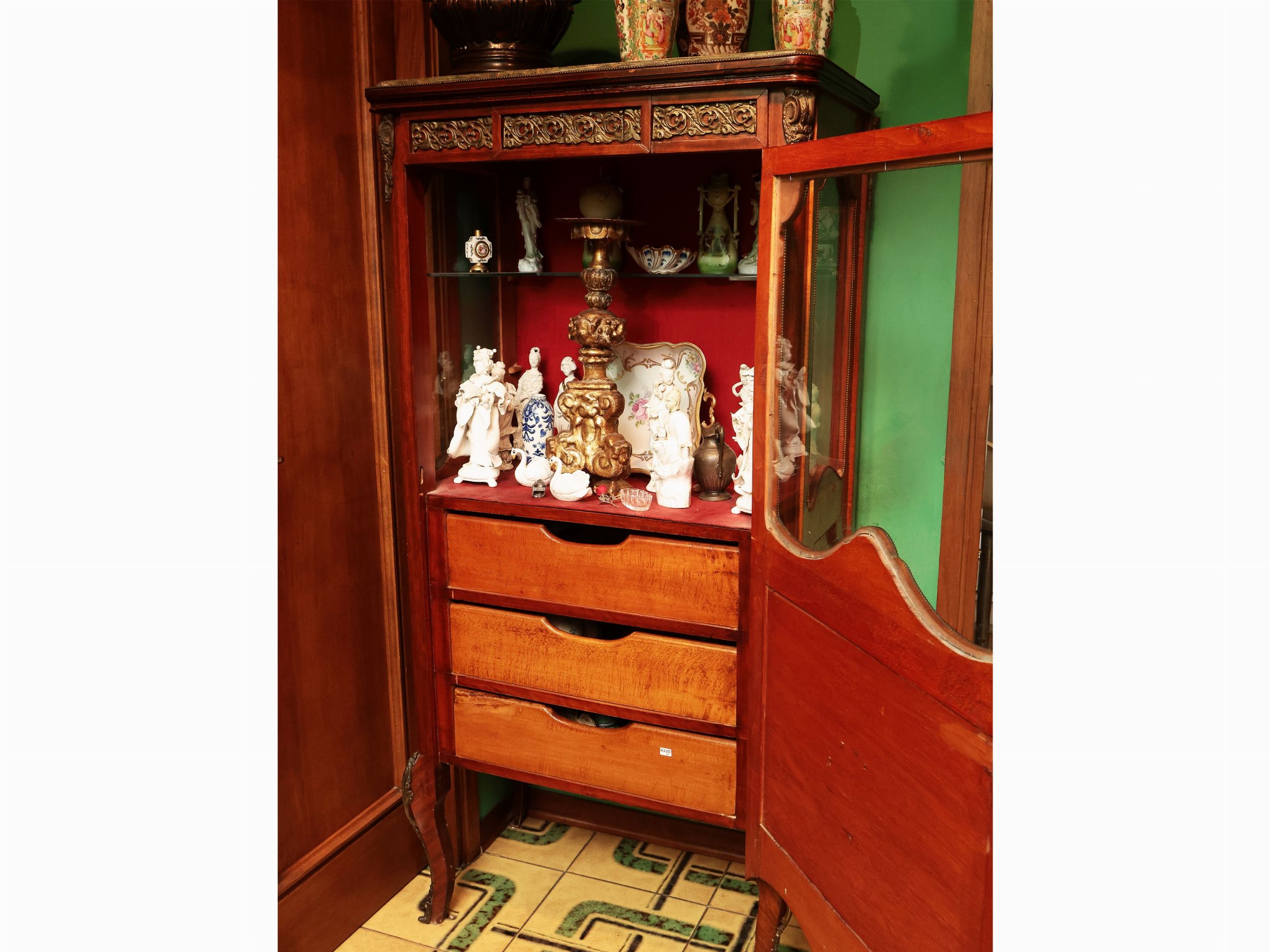 h cm 165x80x50 XX secolo realizzata in stile settecentesco, piano in marmo verde, uno sportello con vetro sagomato sul fronte, all'interno tre cassetti, applicazioni in metallo a ricreare tralci vegetali e profili con perlinatura, difetti