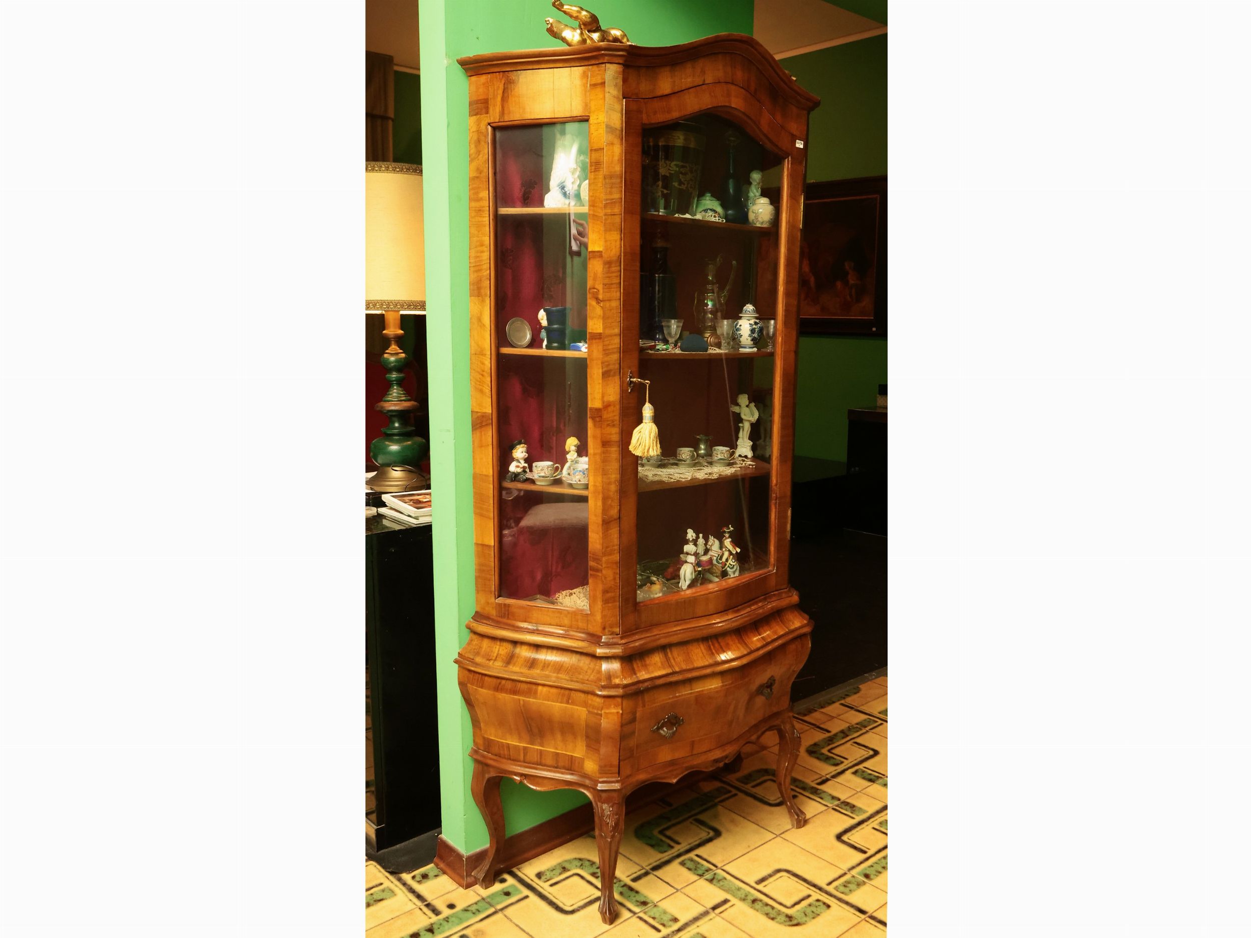 h cm 180x90x38 XX secolo realizzata in stile settecentesco, cappello centinato, uno sportello a vetro sul fronte ed un cassetto sottostante, fianchi lievemente convessi, gambe mosse, lievi difetti