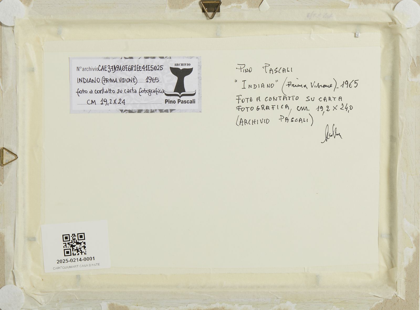 sul retro: certificato di autenticità a cura di Carla Maria Ruta Lodolo ed etichetta Archivio Pino Pascali, Firenze L'opera è accompagnata da certificato di archiviazione a cura dell'Archivio Pino Pascali, Firenze