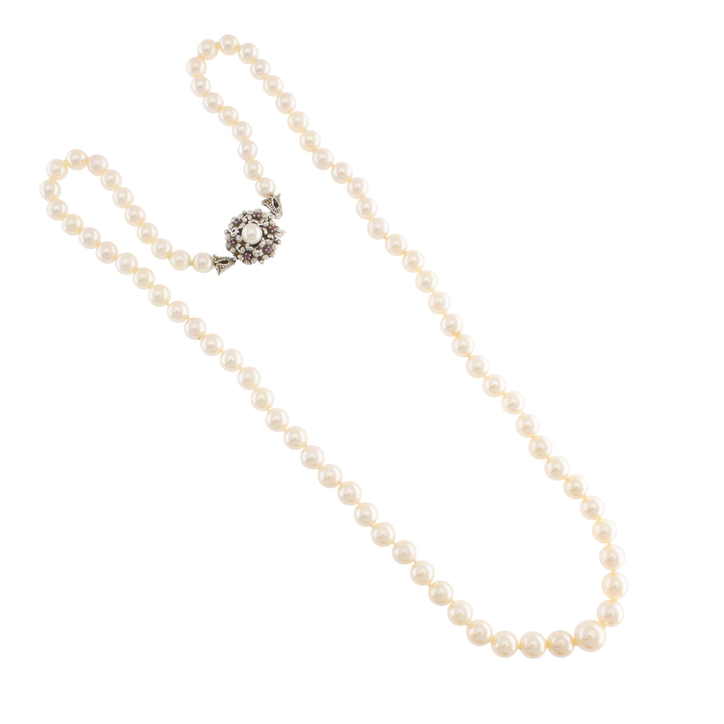 disposte a gradazione da 6,5 mm. a 9 mm. circa chiusura in oro bianco 18kt e rubini, lunghezza 64 cm.
