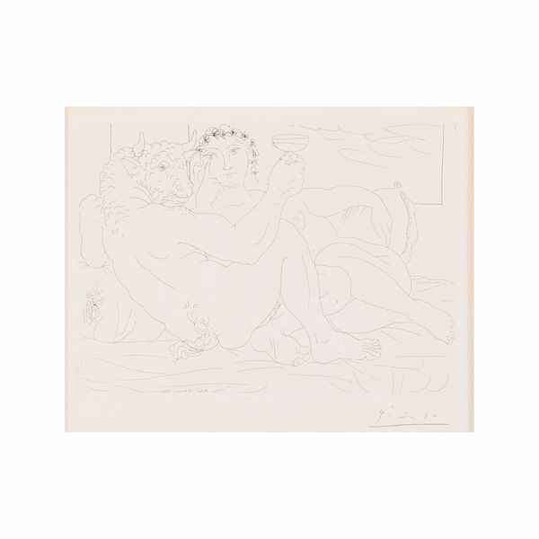 Malaga 1881 - Mougins 1973 'Minotaure' dalla Suite Vollard, 1933, incisione, firmata in basso a destra, entro cornice. Bibliografia: G. Bloch, Picasso. Catalogue de l’oeuvre gravé et lithographiè, 1904-1967, Tomo I, Ed. Kornfeld et Klipstein, Berna, 1968, n. 190, pag. 68.