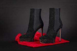 in camoscio color nero, con plateau, suola glitterata, misura 40, tacco cm 14, con sacchetto (nuovi e mai usat [..]