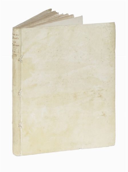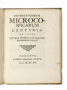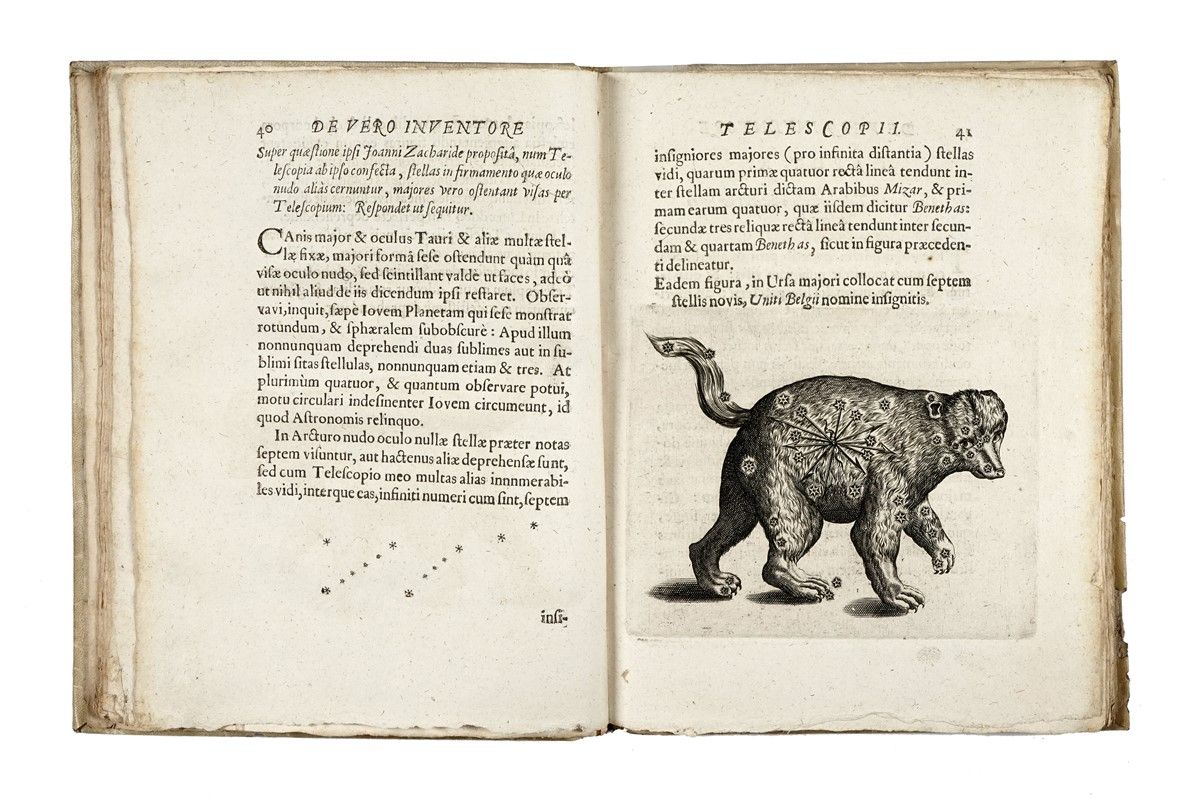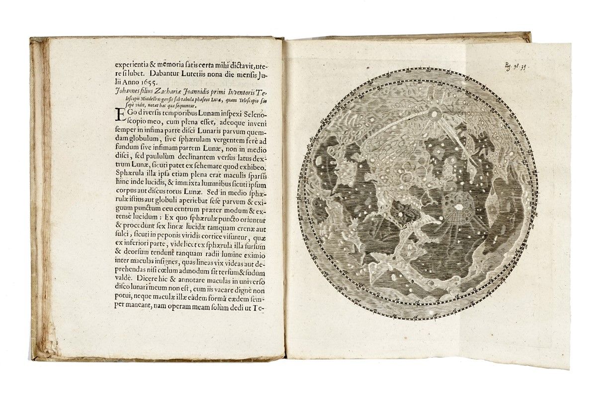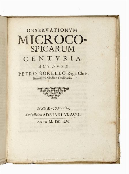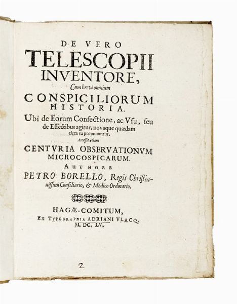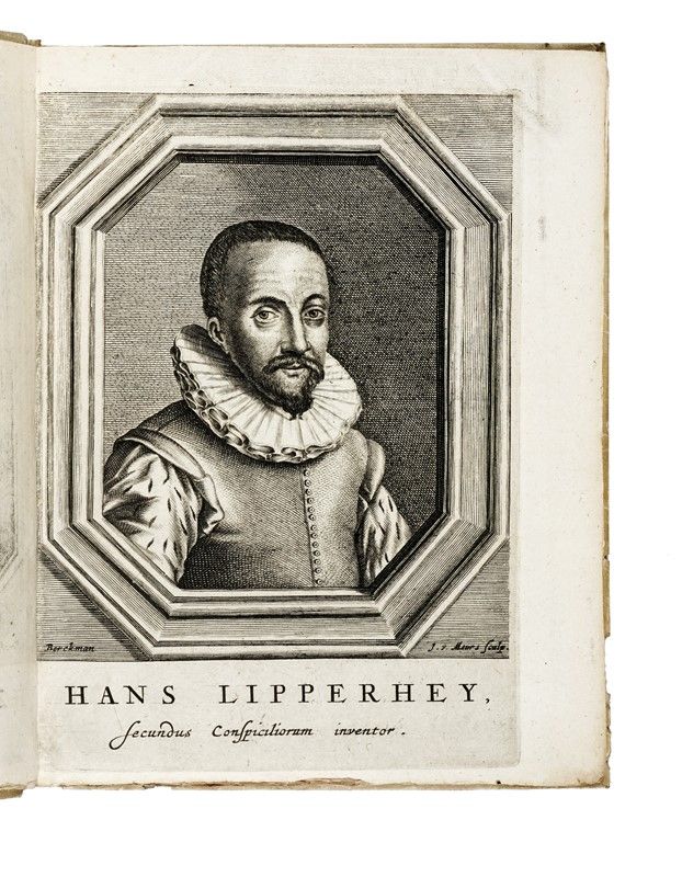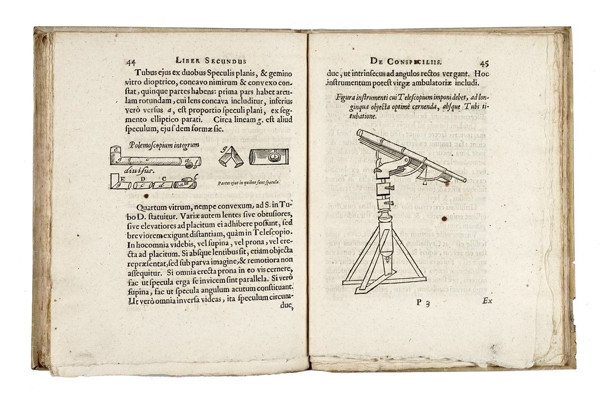 In-4° (mm 210x163) in 2 parti, la seconda datata 1656. Pagine: ([12], 67, [1], 63, [1]; 45, [3]) + 1 carta di Errata Corrigenda non menzionata da SBN + 1 tavola ripiegata raffigurante la luna. Ritratti calcografici a piena pagina di Zacharias Janssen e di Hans Lipperhey, illustrazioni calcografiche e xilografiche nel testo, graziose vignette xilografiche di insetti nella seconda opera. Bellissimo esemplare completo e in barbe, in pergamena flessibile coeva con titolo manoscritto al dorso.