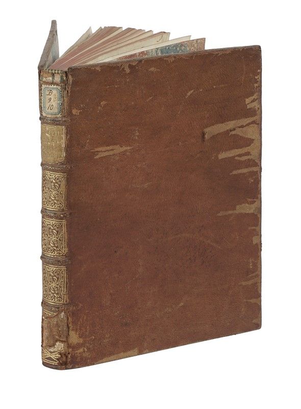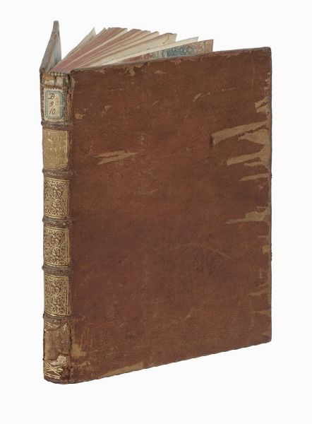 In-4° (mm 207x141). Pagine: [16], 239, [1]. Grande e bella marca tipografica al frontespizio, più piccola in fine, fregi e grandi e belle iniziali xilografiche animate, testo in corsivo. Carta F1 con piccola mancanza al margine esterno, strappetto alla carta H8, frontespizio e carte successive con trascurabili lavorini di tarlo in margine, pallido alone al margine inferiore, qualche macchietta e altre trascurabili tracce del tempo. Piena pelle settecentesca (un po' sciupata), dorso a nervi con tassello e finemente decorato in oro (sciupato), sguardie marmorizzate, tagli rossi.
