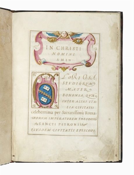 Manoscritto pergamenaceo. 7 fogli scritti e sguardie in pergamena. Testo in cornice. Intestazione decorata a tempera e 1 capolettera decorato con stemma della famiglia Magnani (in oro, blu e rosa). Legatura in pelle. Buona conservazione. Dimensioni: 233x170 mm.