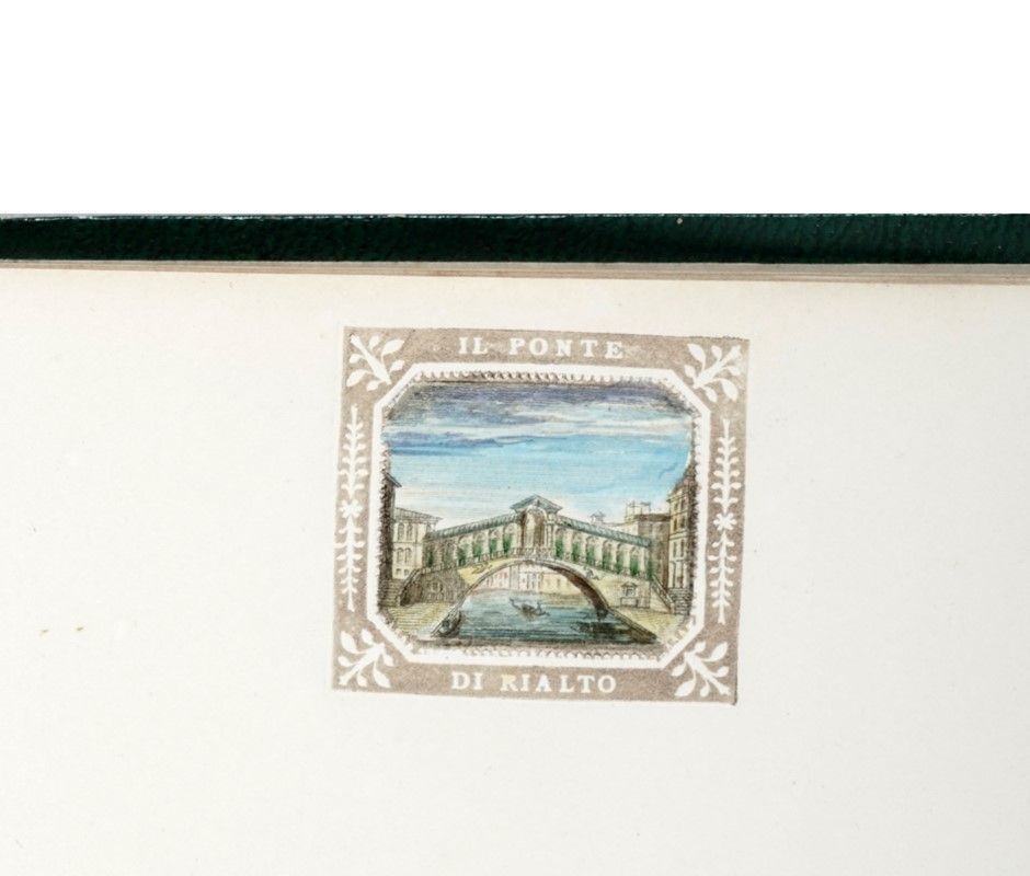 In-8° oblungo (mm 183x230) con frontespizio + [50] carte con piccole vedute di Venezia + [6] carte bianche finali. In mezza pelle coeva con piatti rivestiti in percallina verde (minimi difetti).