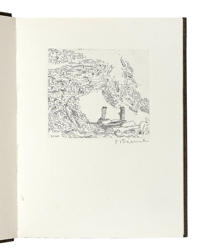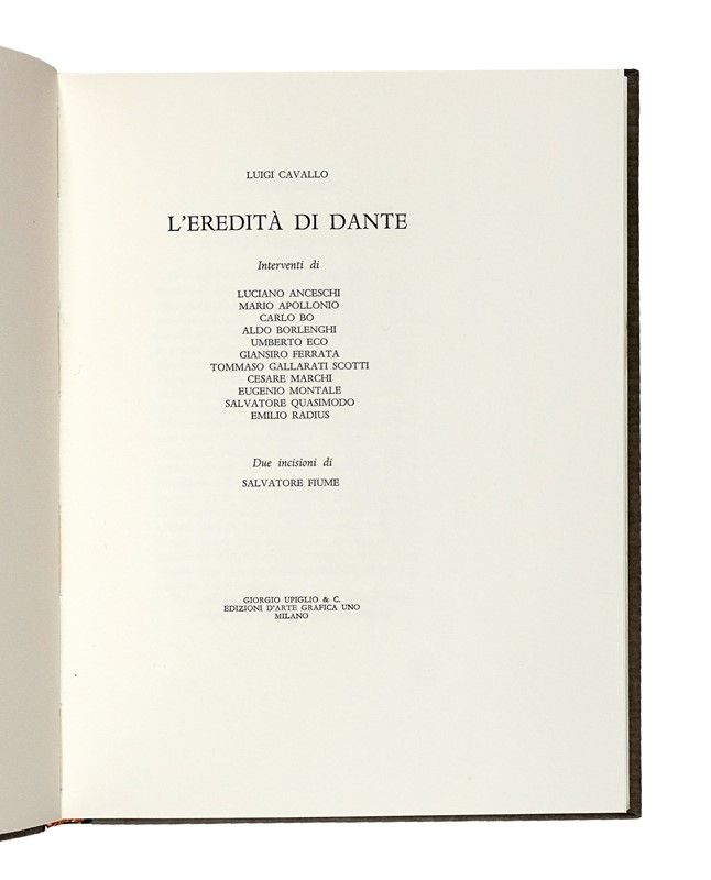 In-8° (mm 210x165). Ottimo esemplare, con 2 acqueforti originali di Salvatore Fiume a piena pagina nel testo, firmate a matita dall'Artista sui torchi di Upiglio e protette da velina. Legatura editoriale in mezza pelle, con titolo in oro al piatto e ampi fregi dorati con titoli al dorso; cofanetto editoriale in cartonato coordinato, con lievi tracce di polvere. Uno dei 100 volumi facenti parte della prima serie, su una tiratura complessiva di 440 copie.