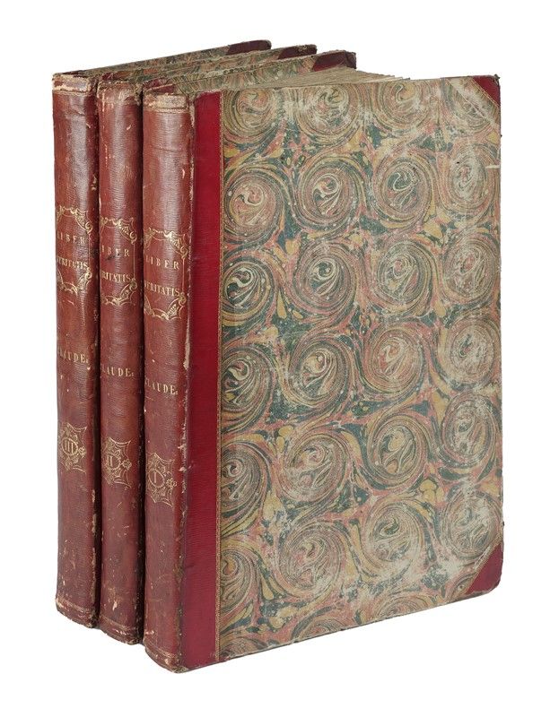 In-folio (mm 440x280). Pagine all'inizio di ciascun volume: 14, 6, [8]. Ogni volume è completo delle 100 tavole calcografiche stampate in bistro, per un totale di 300 tavole, ognuna con la sua velina di protezione. Il volume I e II hanno rispettivamente all'antiporta il ritratto calcografico di Richard Earlom e Claude de Lorrain. Assente il ritratto nel terzo volume. Occasionali fioriture marginali. Carte in barbe. Mezzo marocchino rosso con punte, piatti marmorizzati e titoli dorati ai dorsi (un po' sbiaditi e con qualche piccola sbucciatura).