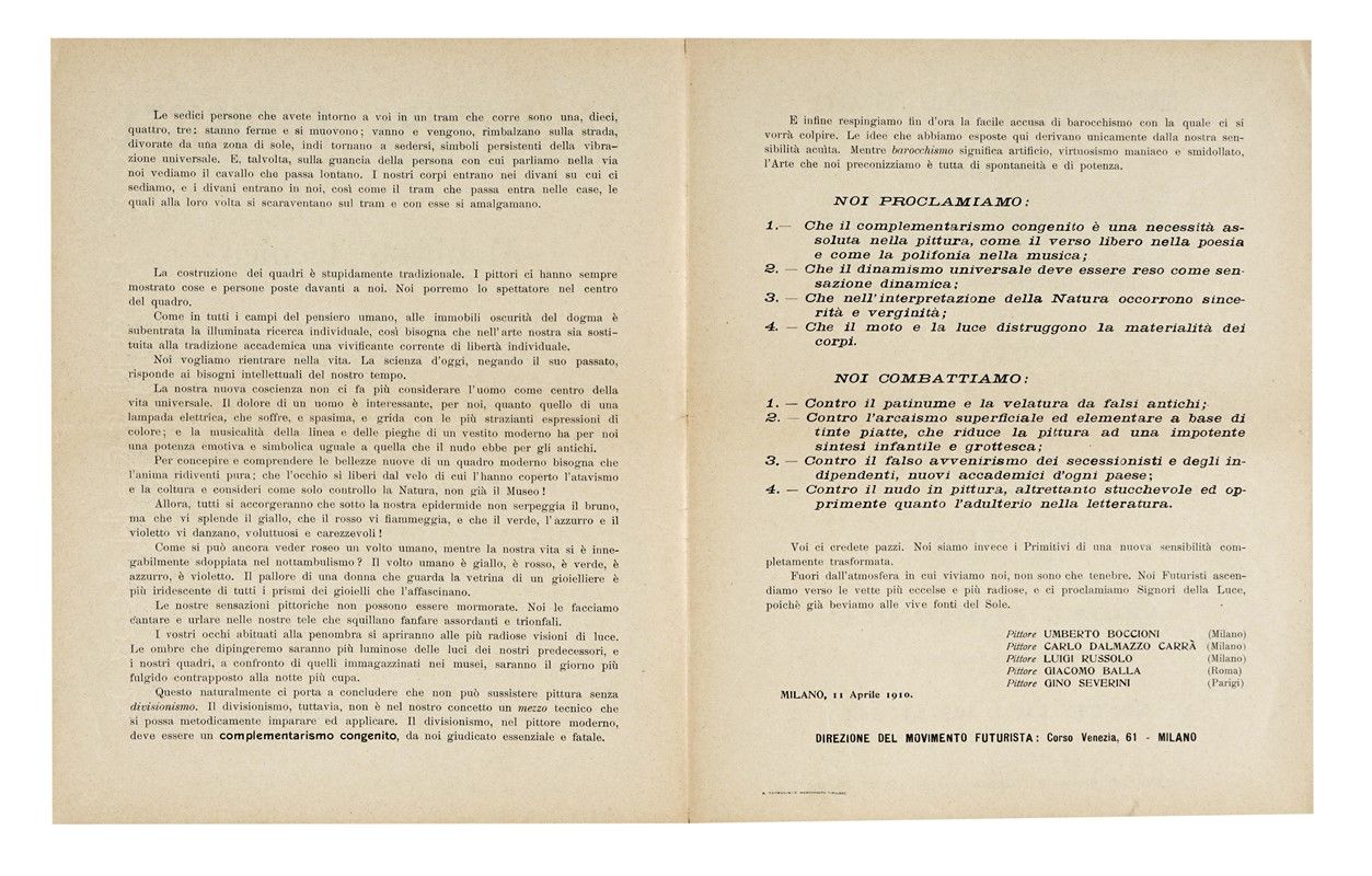 In-folio (mm 628x 436). Carta [1] stampata recto-verso. Esemplare fiorito, con strappetti marginali e lievi bruniture ai punti di antica piegatura. Annotazione manoscritta al recto e due splendide parole in libertà di Marinetti e Cangiullo al verso. SI AGGIUNGE: Id., Pittura scultura futuriste (dinamismo plastico) con 51 riproduzioni, quadri, sculture di Boccioni, Carrà, Russolo, Balla, Severini, Soffici. Milano: Edizioni Futuriste di Poesia, 1914. In-16° (mm 186x135). Pagine [8], 469, [3] (di 5) con 1 ritratto fotografico di Boccioni in antiporta e 6 (di 51) riproduzioni in bianco e nero di quadri e sculture su carta patinata. Rinforzi marginali all'occhietto, al ritratto e alle pagg. da 465 in poi; maldestri restauri ad alcune carte. Esemplare rifilato, con fioriture sparse. Mancanti 45 (di 51) tavole in bianco e nero fuori testo. Legatura successiva in mezza tela, con titoli in oro su tassello al dorso e sguardie rinnovate; entro cofanetto in cartonato, con la scritta Boccioni applicata al dorso. Ex-libris cartaceo al contropiatto anteriore e al recto del ritratto dell'Autore. Dedica autografa di Umberto Boccioni. Esemplare da studio. SI AGGIUNGE: Id., La pittura futurista. Manifesto tecnico. Milano: Poligrafia italiana, 11 aprile 1910. In-4° (mm 290x230). Carte [2]. Segno centrale di precedente piegatura e lievissimi strappetti marginali, altrimenti ottima conservazione.