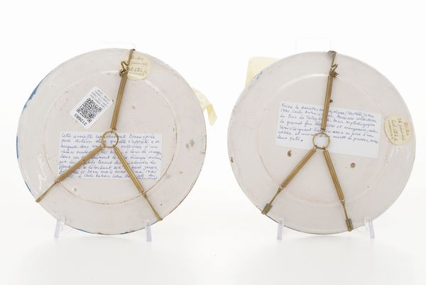 Maiolica. Diametro cm 18,6 circa. Conservazione: ottima; insignificanti cadute di smalto ai bordi. Provenienza asta Christie’s 26/06/2002 lotto nr. 187 Questi due tondini in maiolica, terracotta rivestita di smalto stannifero, decorati con colori a gran fuoco, appartenevano alla stessa serie decorativa castellana. Le due scene maggiori nel fine stile pittorico di Liborio Grue, istoriate di soggetto classico, vedono “Pan che spia la ninfa Siringa” e “Venere che accarezza il capo di Vulcano dormiente, con due putti”. La prima, più rara, deriva da una stampa di Egidius Sadeler, mentre la seconda, di cui non si conosce la fonte grafica, è stata spesso utilizzata dal padre Carlo Antonio Grue. (L.Arbace, Carlo Antonio Grue. Il trionfo della pittura, Colledara (Te) 2002, pp.160, 221, 239) L’ornato delle tese, a fondo giallo chiaro con putti festanti tra ciuffi fioriti e mascheroni su cartigli grigi, apparteneva al repertorio di Carlo Antonio Grue (vedi Arbace 2002 pp. 56-57), ma il muso grottesco felino è una sorta di marca del figlio Liborio, anch’egli abile pittore della famiglia Grue