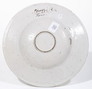 Maiolica. Diametro cm 29,2. Conservazione: buona; sbeccatura con felatura alle ore 5 restaurata; tracce di lumeggiatura in oro Il piatto è profilato al bordo da un sottile nastro giallo, blu e manganese che incornicia un motivo a larghe girali fogliate e fiorite che occupano la larga tesa. In alto, due putti reggono uno stemma araldico nobiliare sormontato da un elmo e accompagnato da tre aquile coronate, lo scudo ospita un toro su fondo bianco. Nel cavetto è dipinto l’episodio di Rinaldo sotto l’incantesimo di Armida ripreso dalla “Gerusalemme Liberata” di Torquato Tasso. In primo piano Rinaldo seminudo abbraccia Armida sotto ad un grande albero posti in un ampio paesaggio con riva e piccolo viandante in lontananza
