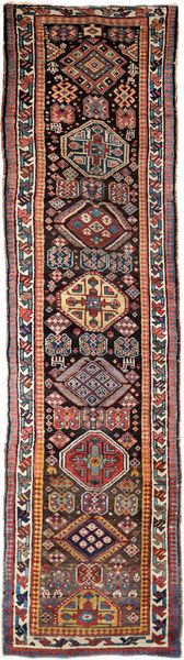 cm 97x373 Questo Karabagh è un classico esempio della produzione tessile caucasica della fine del XIX secolo. Il tappeto, di formato longherese, è caratterizzato da un fondo scuro, che esalta i motivi geometrici e i medaglioni policromi disposti lungo l'asse centrale. Le forme romboidali intrecciate sono tipiche dei tappeti Karabagh e riflettono l'influenza sia turca che persiana. La bordura laterale presenta un motivo a foglie stilizzate alternate a fiori, che incornicia l'insieme con armonia e movimento. Difetti