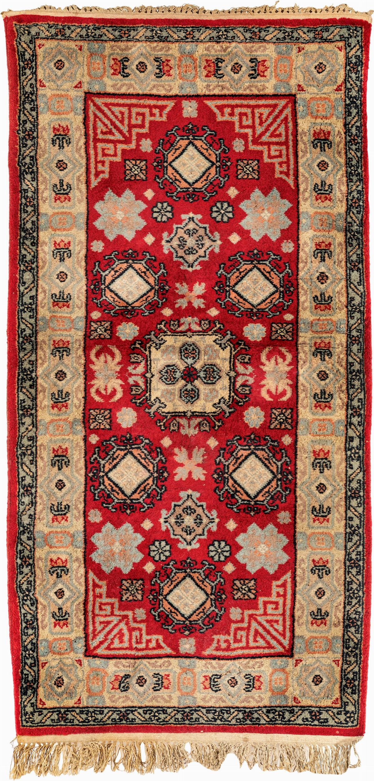 cm 141x72 caratterizzato da un fondo rosso acceso, decorato con motivi geometrici simmetrici e floreali stilizzati. Il design è dominato da medaglioni centrali e una bordura con motivi angolari a greca, che contribuiscono all'equilibrio visivo del tappeto.