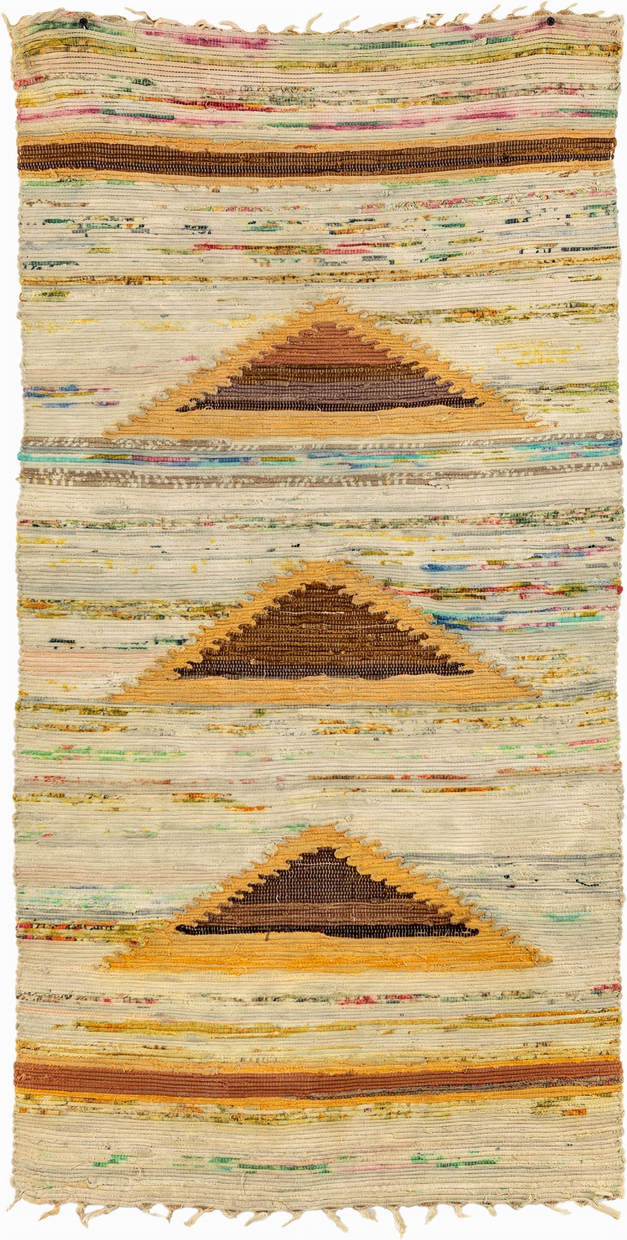 cm 133x68 realizzato a mano con tessuti riciclati, una tecnica tipica delle tribù berbere del Medio e Alto Atlante. Questo pezzo si distingue per il suo design geometrico essenziale, con tre motivi a forma di piramide su uno sfondo dalle tonalità neutre, arricchito da leggere sfumature colorate. Realizzato con tessuti di recupero come cotone, lana e fibre sintetiche, il Boucherouite è un tappeto dal forte valore ecologico e simbolico, nato dalla creatività delle tessitrici berbere.