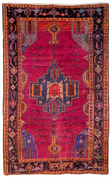 cm 230x145 Il campo magenta è dominato da un grande medaglione geometrico centrale con dettagli angolari che evocano l'architettura tradizionale. Il motivo a 'freccia' stilizzata e le cornici a zig-zag donano movimento alla composizione. Il bordo principale, caratterizzato da elementi floreali e stilizzazioni zoomorfe, è incorniciato da due bordure secondarie con motivi geometrici